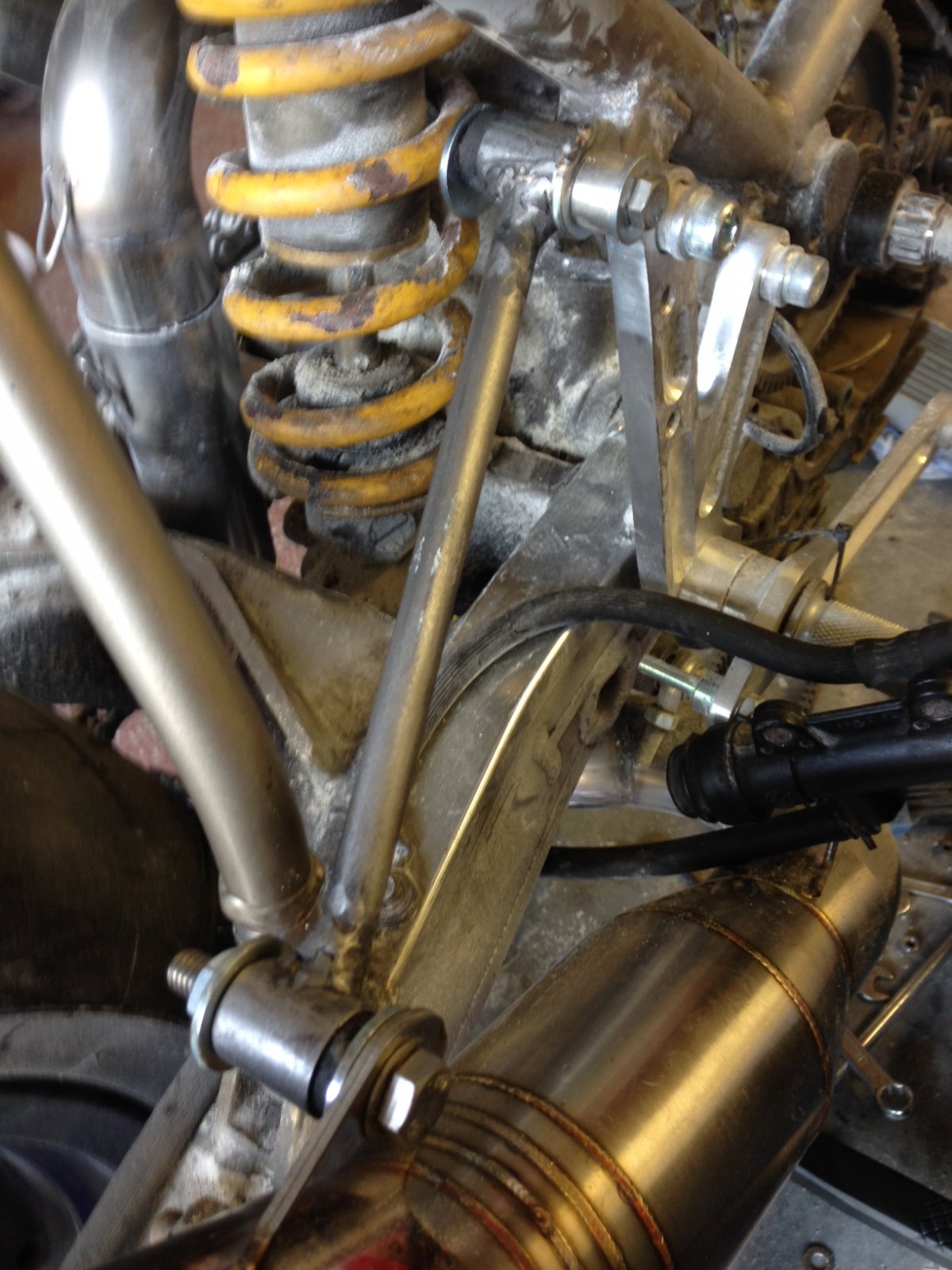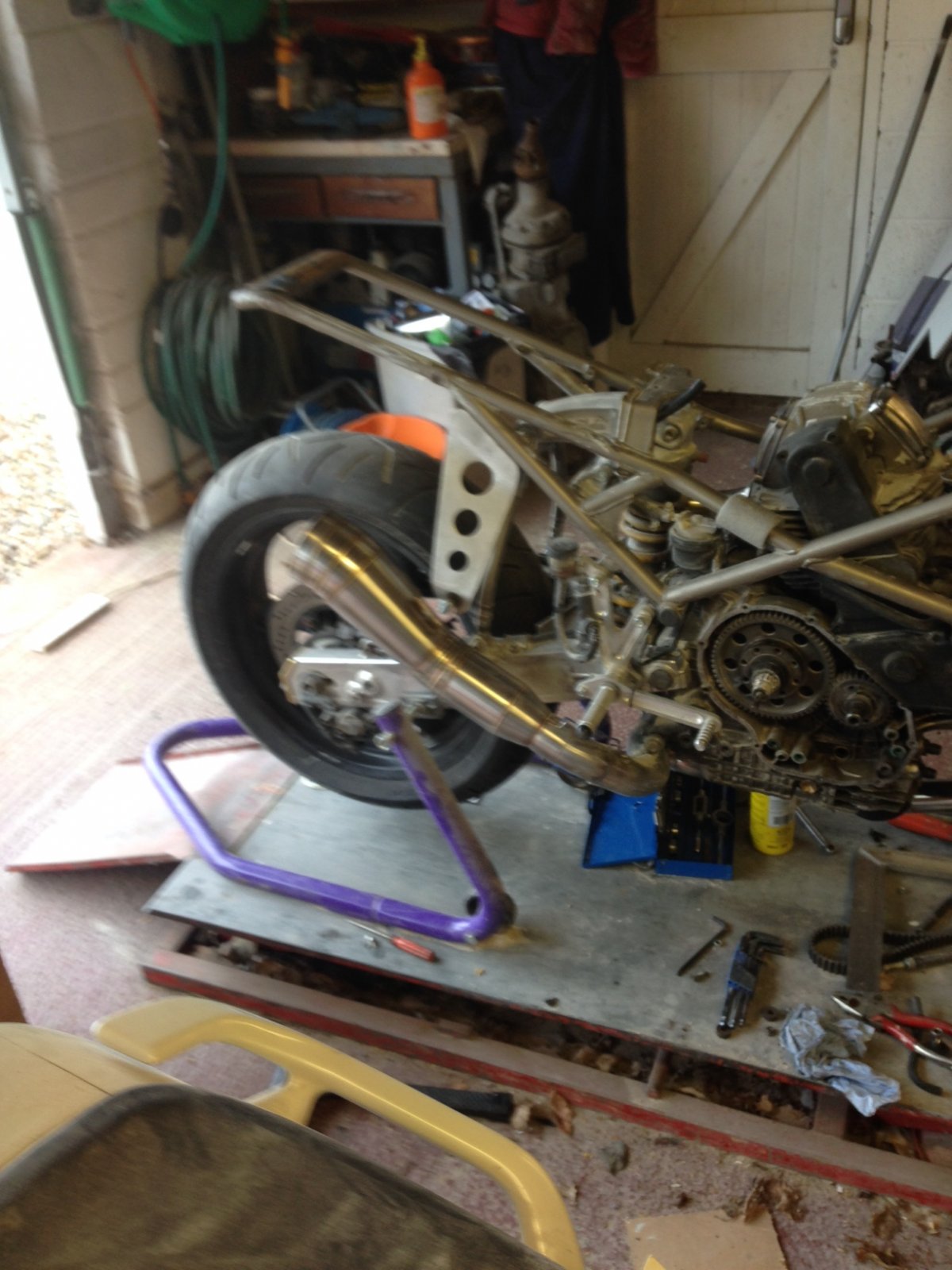 Insomnia strikes again so I will try and get you up to date with progress. I decided the 4mm aluminium exhaust hanger bracket was too flimsy and with a vibration mount at one end was not a "fail safe" bracket so I knocked this up from some 20mm OD x 1mm tube and some 10mm OD x 1mm tube.
