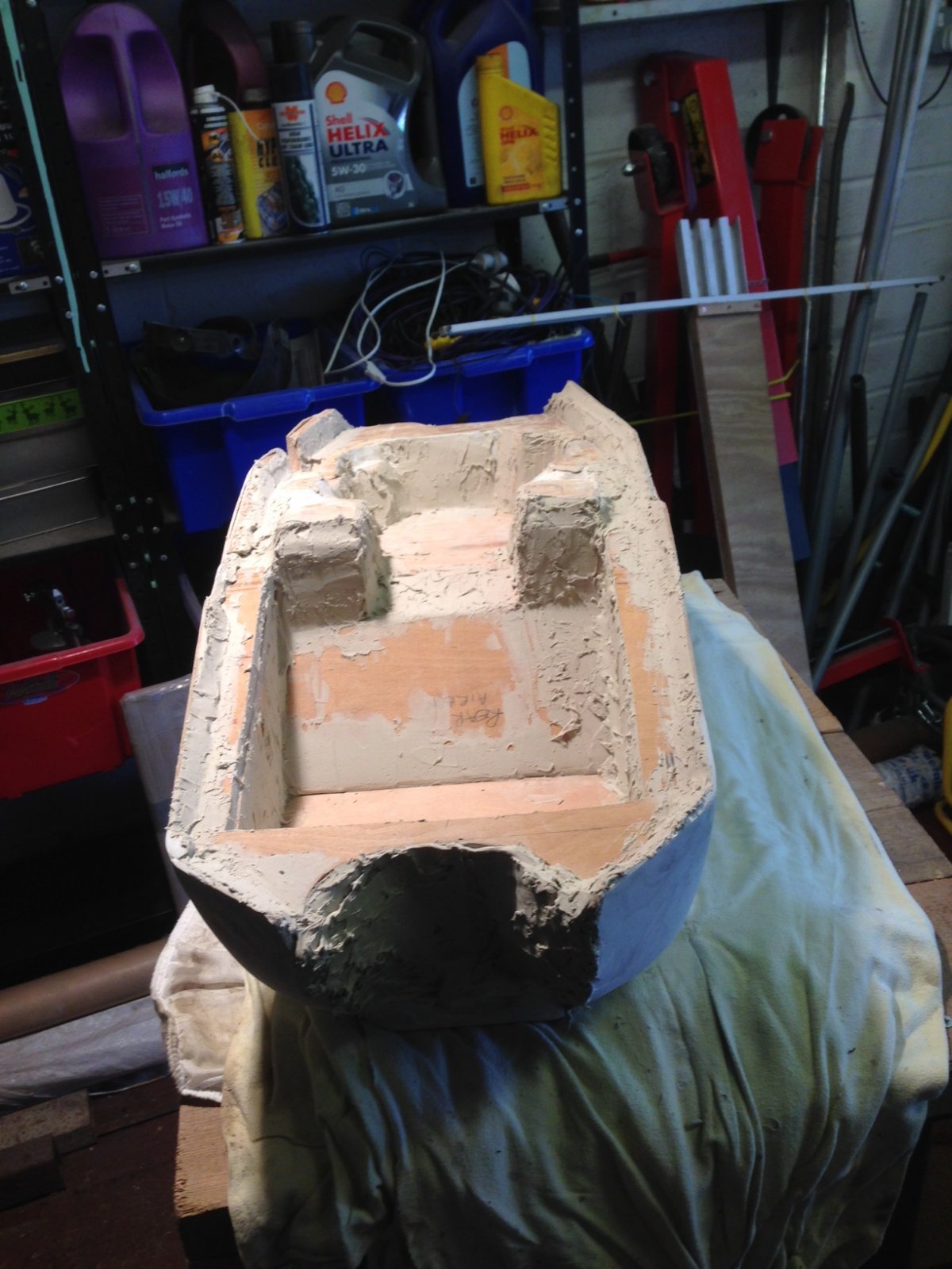 Further filling of the underside of the tank has also been done this week. This is going to take a long time because a) the convoluted shape means that power sanding tools cannot be used easily and b) I am concerned there is not enough clearance between the front seat support on the frame and the bottom of the tank. Also I discovered that to get the tank off it has to be tilted backwards and the act of tilting it causes other clearance problems at the front. Unfortunately I think I need to remove about 8mm from the section where it is plywood laminated about 50mm deep and I cannot get any sort of saw in there without threatening the nicely sanded top surface.