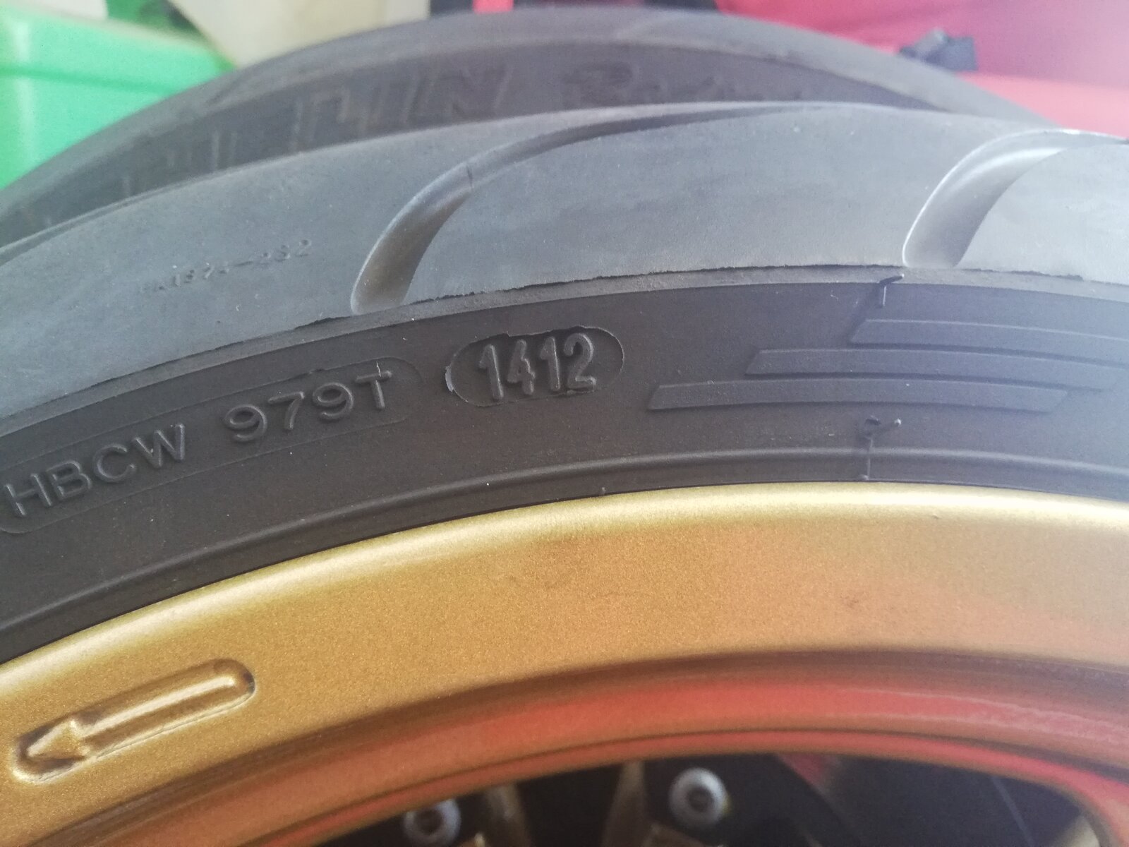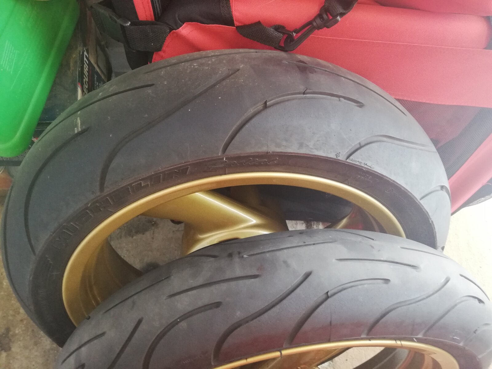 12. Took the wheels out of my superlight ready for new tyres this week. The old ones are 10 years old, but look like new, thanks but no thanks. I've only done 120 miles on the bike before it misbehaved and hasn't been ridden since last July. Thanks to a previous owner greasing all bolts, they all came undone easily, It's off to Baines at Silverstone on Saturday for a light recommision and sorting out.