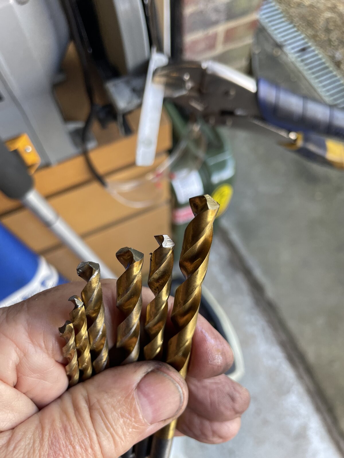 Well, over the past few days really. GSXR work. Changed coolant after full flush and radiator removal. Drilled out a snapped bolt. Took ages. Tapped hole. Got fed up with engine hunting and cutting out when hot so, in desperation changed plugs (after previously testing the old ones which tested and looked fine). Bike now runs sweet as a nut. Adjusted cold start and idle speeds. Then decided to re sharpen some HSS drill bits after the surgery. Busy, busy, busy.