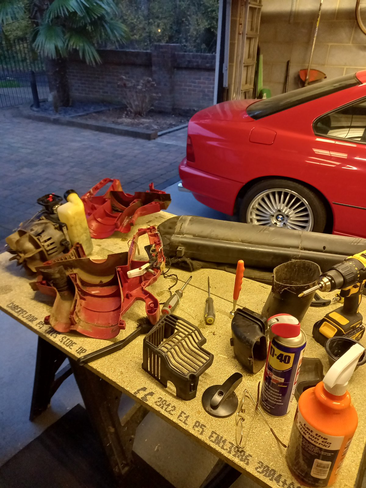I had carried out some miner repairs to a few body components and was looking forward to reinstalling today. Being particularly windy and being Autumn my shed and garage were constantly being filled with leaves. the leaf blower would send them out but the wind blew them straight back in. OK, I thought, just collect them. Three pulls on the leaf sucker and the pull cord snaps. The rest of the afternoon and probably most of tomorrow morning will be spent replacing the pull cord which has involved the removal of 16 bolts and a load of grief as can be seen int he photo.