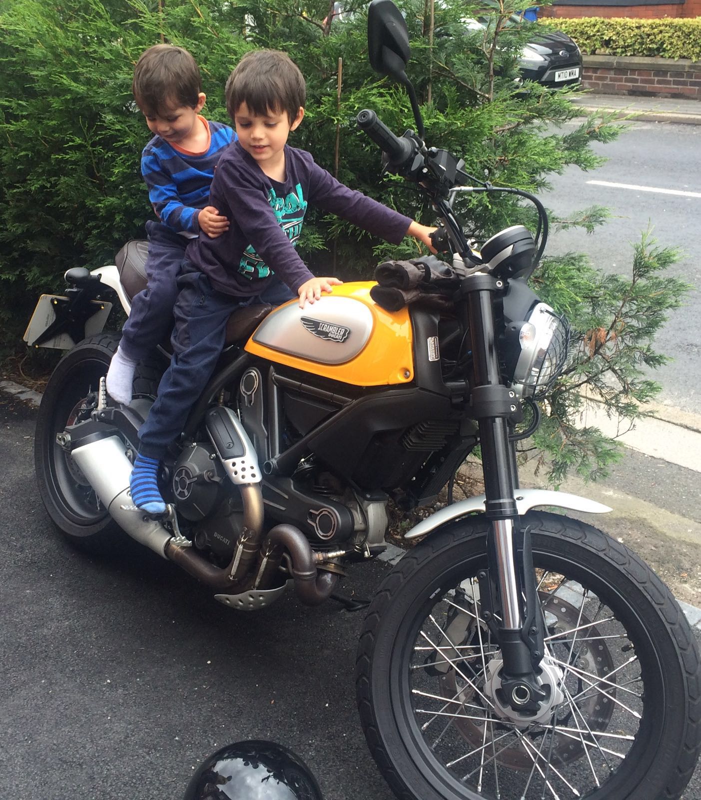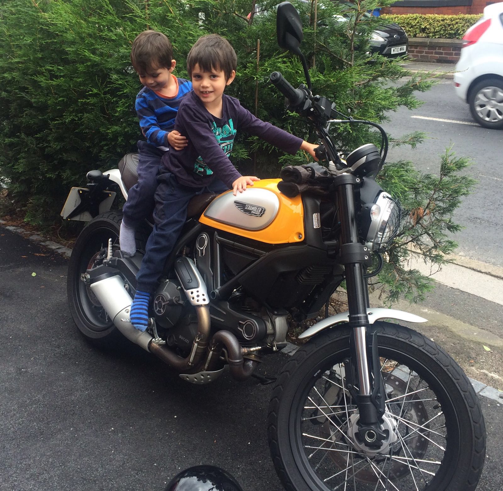 I've been out on the scrambler for a few hours and discovered more new roads I've never been on. Some were fast flowing, twistie Tarmac with next to absolutely bugger all traffic on them. Next time I'll head out on them on the Pani Whilst I was out I called in on #1 son and family for a cuppa. Grandchildren (4 & 2) wanted to sit on granddad's bike before I set off again. My daughter in law will be shitting herself now in case the kids get the bug