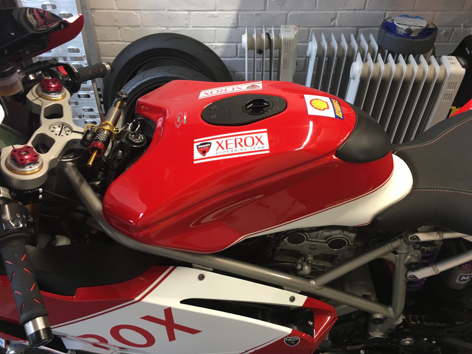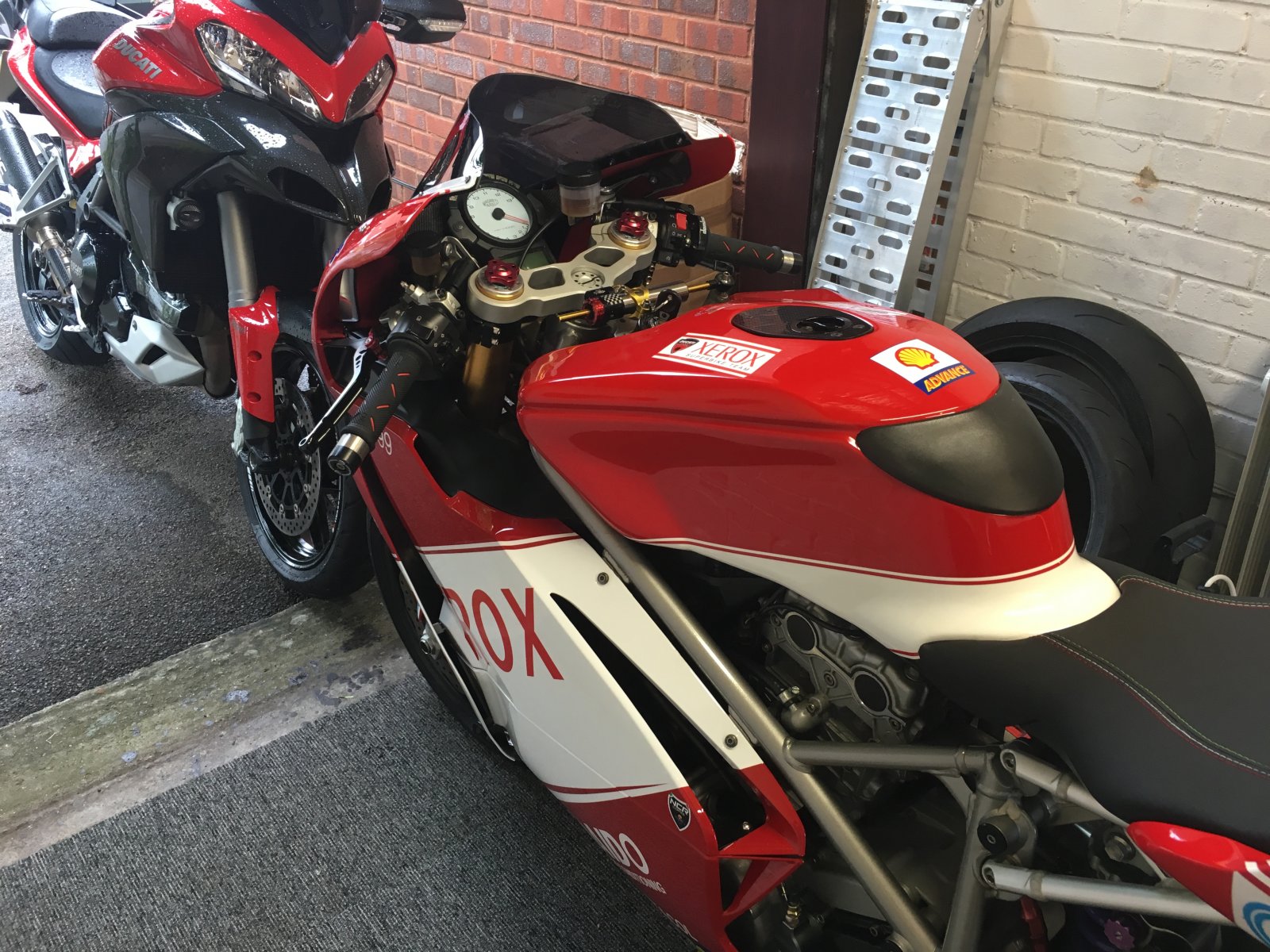 NC29 400RR all back together and fired up. Running sweet as a nut and the new SS exhaust has a lovely angry sound to it but still less than 103 db so we're fine for Mallery - well at least Carole is, fingers still crossed for the 853. Andy