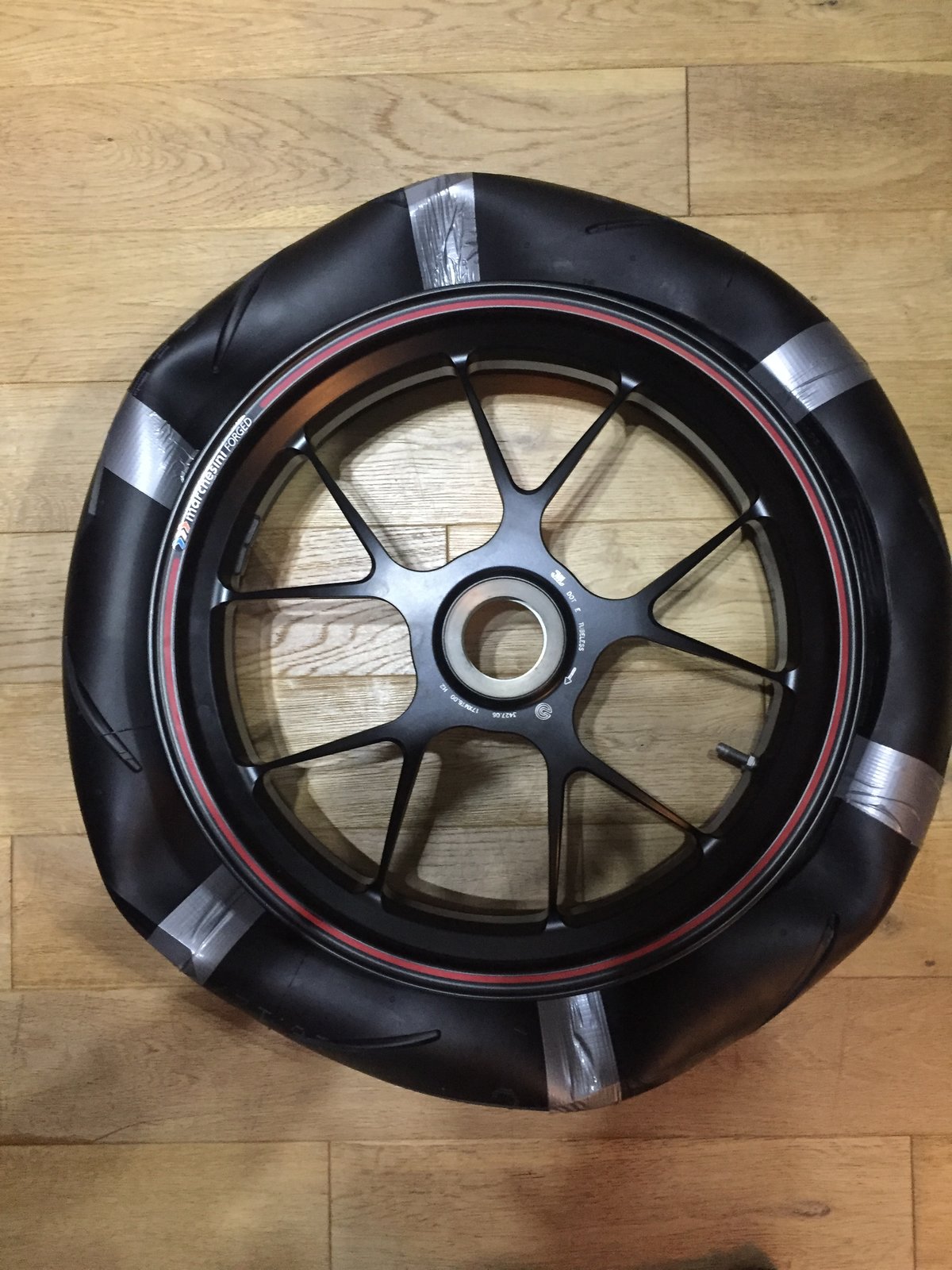 Well, for a week now I have been contemplating trying to manually fit my new road tyres to my new wheels, with some trepidation... I have watched the tie wrap method and the gaffer tape method on You Tube and seen people struggling, while pretending it was easy I didn't fancy the tie wrap method as it appeared they could potentially cut or nick the tyre - so decided to try the gaffer tape method on the rear wheel tonight. I squeezed the side walls in and taped in 6 positions - first measuring the inner diameter to see if the diameter changed allowing easier fitment. What actually happened it the tyre was pulled very slightly out of round. With the wheel on the floor I pushed the tyre over the rim with the larger part of the oval going first - no washing up liquid or lubricant used and feck me - 10 seconds and it was on! Down to Tesco's - smeared a little washing up liquid on the inside of the still exposed rim - air in the tyre and it seated at 55 psi Job done, easy too - hope the front goes as easy, but that will wait for another day