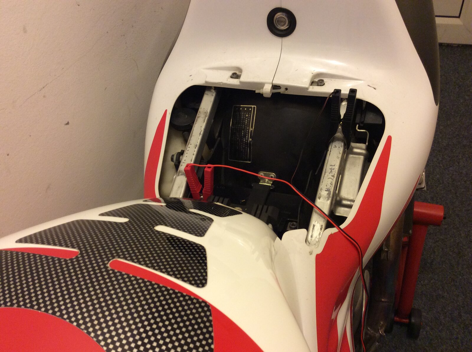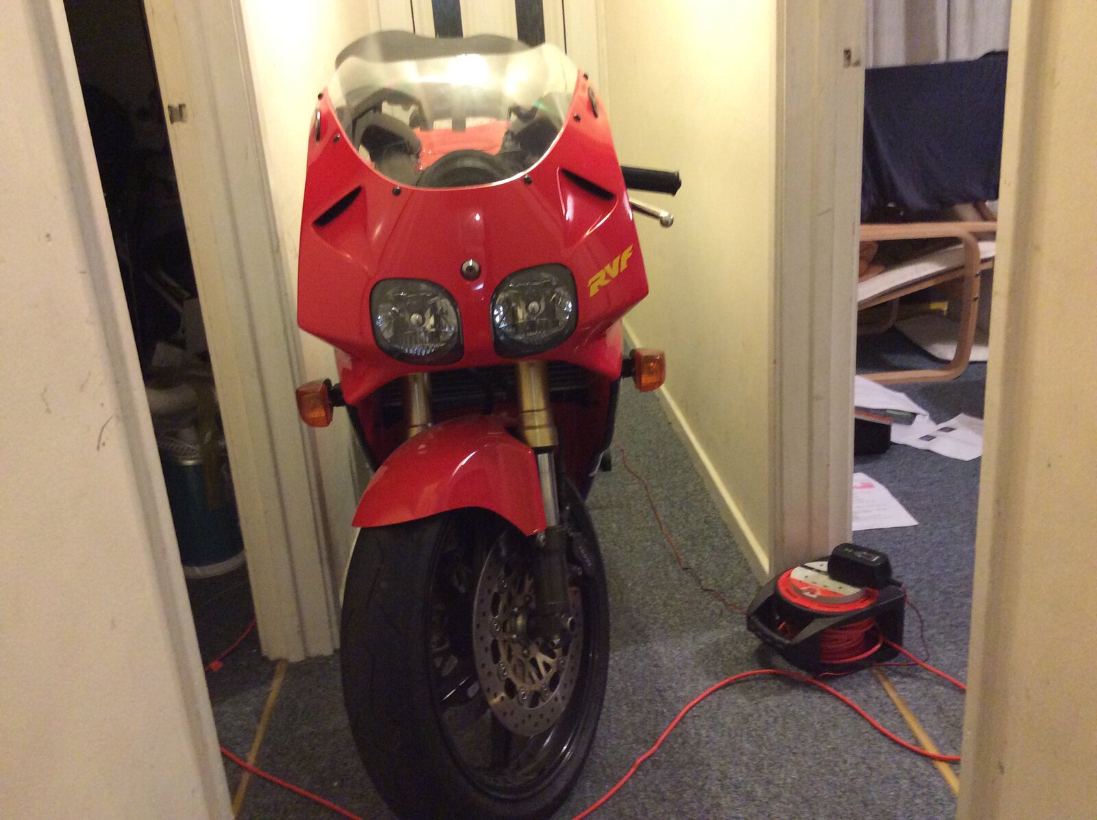 Bought a battery maintenance charger from Halfords, £25 so not expecting much joy, it’s plugged into the rvf in the house, Dougal helped he’s a good boy. We also had a lovely curry st Stamford bridge ( North Yorkshire) after delivering some sofas to place off the a64 near malton absolutely beautiful area that you would never know existed unless you were delivering sofas, be fantastic riding a bike around that area but not a sports bike