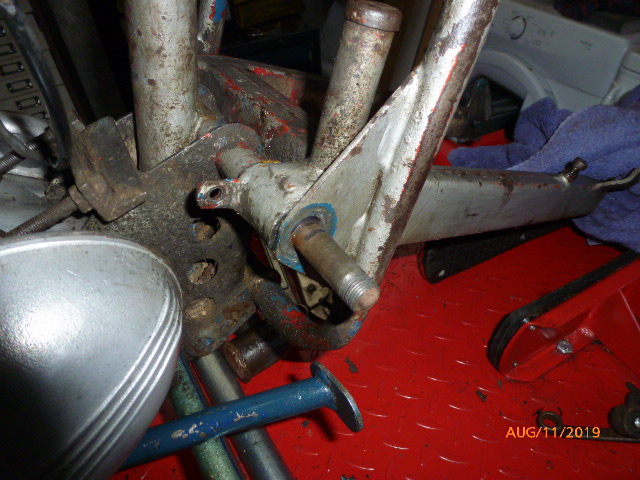 6. Continuing the struggle today to remove the swinging arm pin on my Greeves Scottish, the pin is well and truly seized in the frame, as can be seen i have moved it so far but at the price of wrecking the two main nuts ( cycle or BSF threaded ) using an impact gun and packing it out with spacers bit by bit.