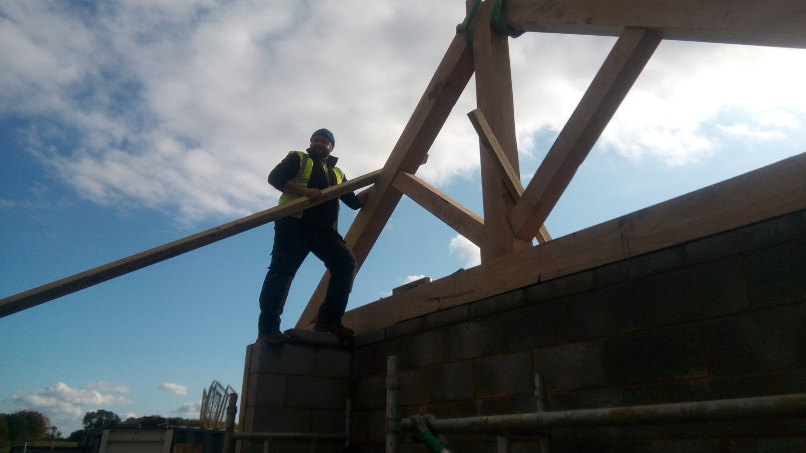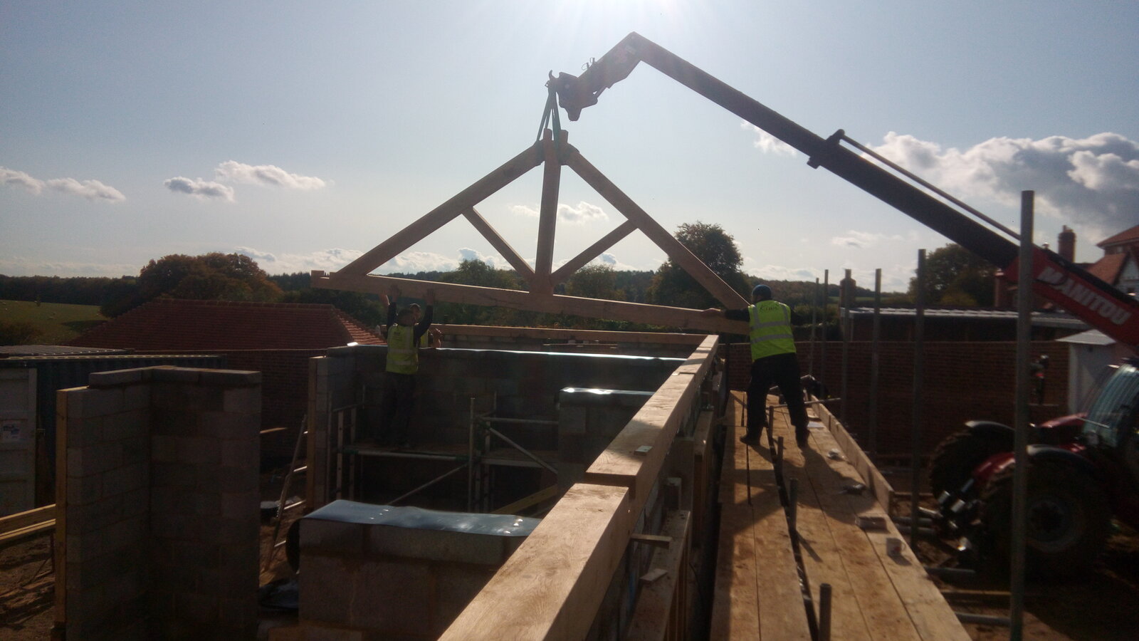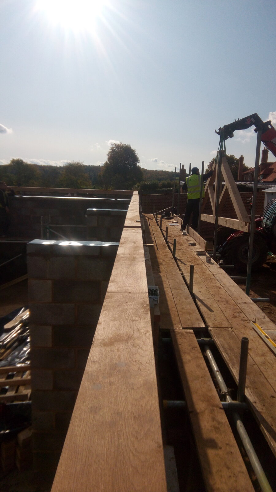 Finally started putting this roof together.. We were due to start yesterday but I noticed that the drop on the rafters was such that the soffit would missed the top of the window frame and hit the glass! As I didn't want to recut all the rafters and hips the easist solution was take the blocks up another corse . Good fun day today, bit of a pain with the fork lift, a crane would have been better but we got there . Wall plates are bowed to fuck and as they are 165x165 oak I can see no way of sorting em so may have to cut the birds mouths in a few rafters a bit further back where the plate bows out ....