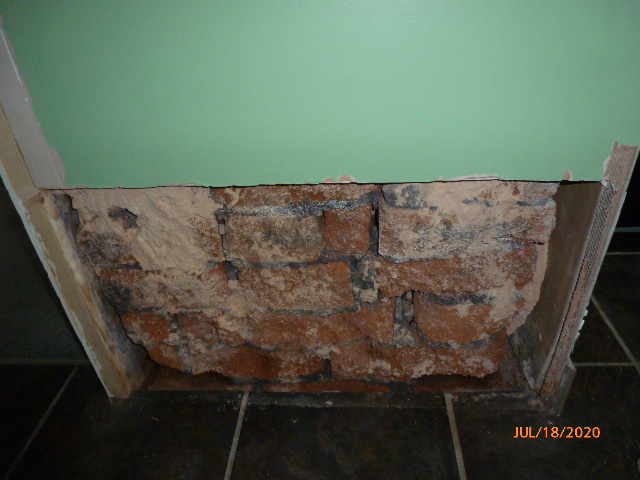 Bitten off more than i can chew ? My kitchen/ hallway single brick wall with an isolated damp patch. It's been like it since we moved in 2 + yrs ago, 1920's ex council 3 bed semi, solid floors now not sure if that was what they were originally. After exposing this area i found wet rotted bits of timber between the brick courses as seen in photos, after hacking it all out on the exposed side the other side the painted hallway area is still wet, the bottom of the door frame is still touching damp ground level i think. Any suggestions on how to go about sorting this problem ? i think the wall is load bearing . The damp bubble appeared on the plasterboard were the dab was located. The brick work has been exposed for about 2 weeks.