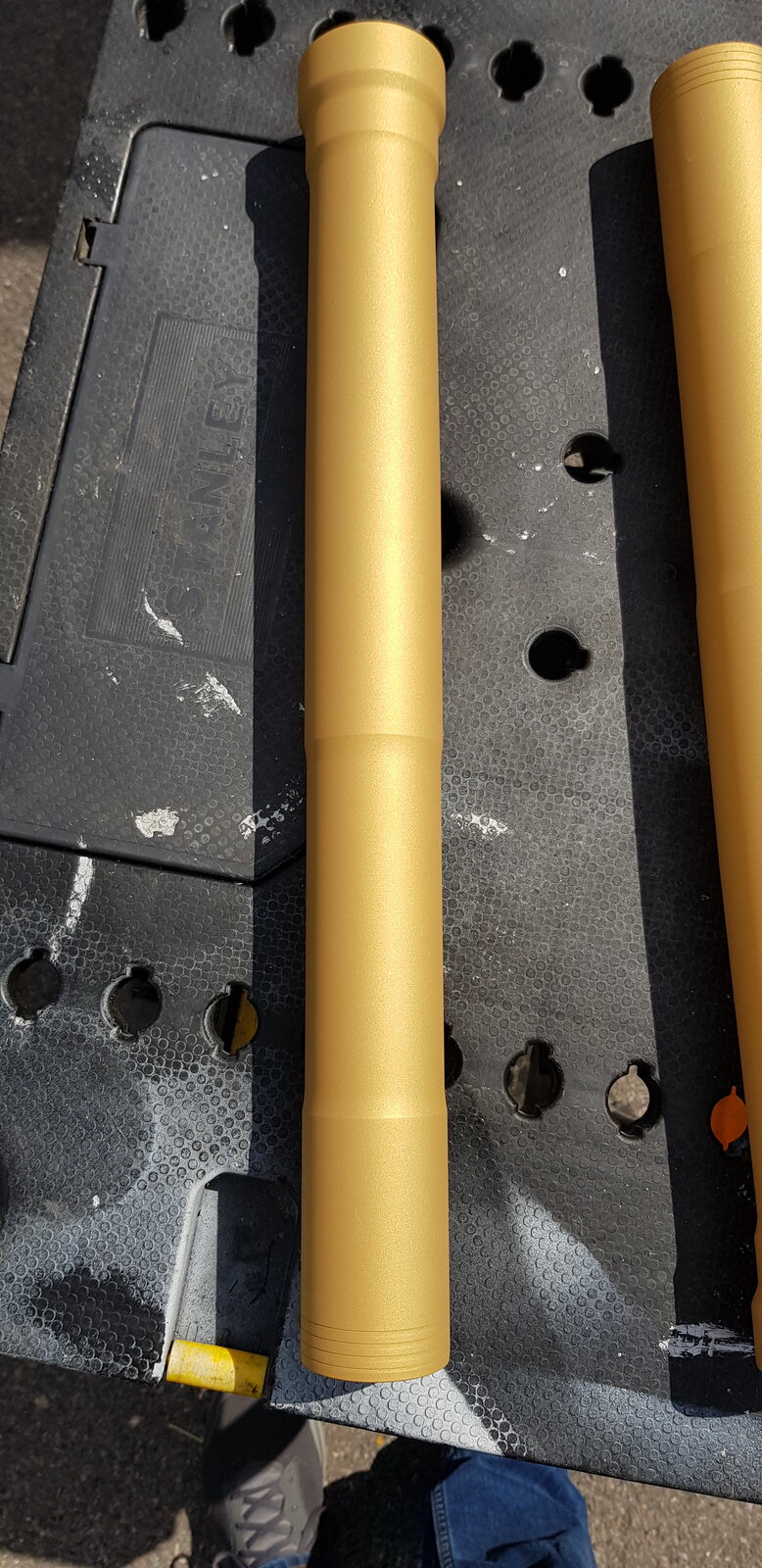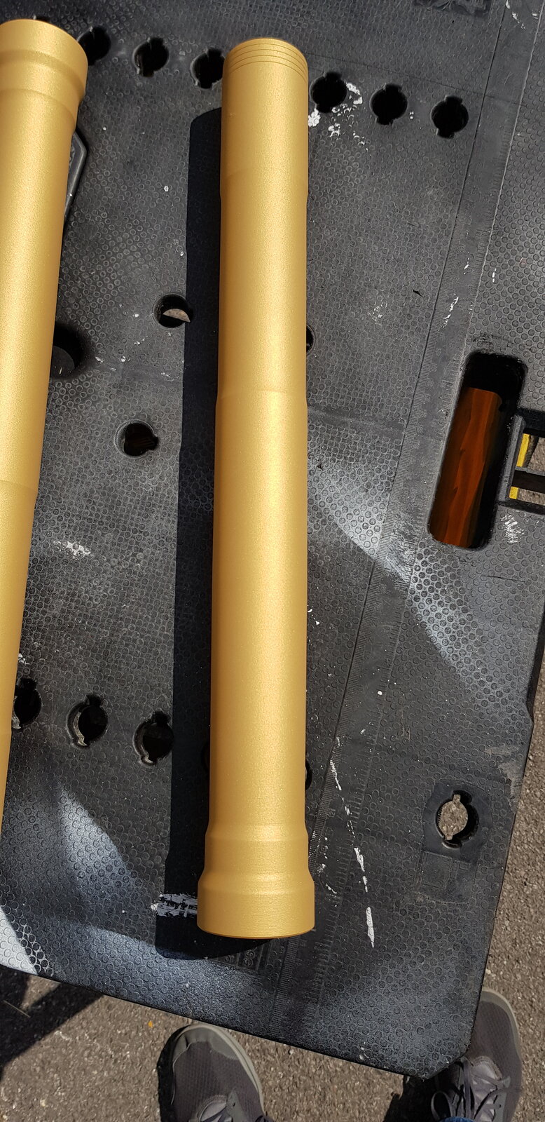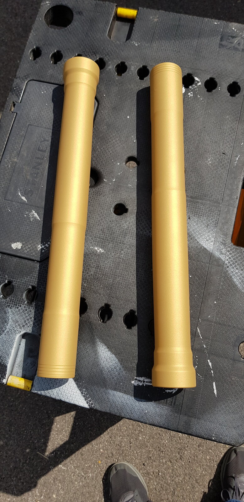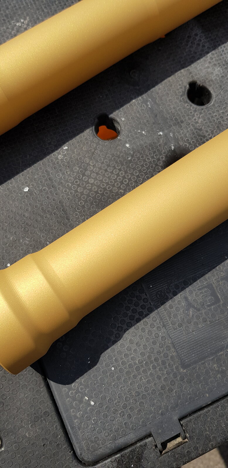 1098S Showa forks that had a small amount of corrosion due to stone chipping. Decided to strip them out and get them Cerakoted. This is a metallic gold and I'm chuffed to bits. Most definitely NOT cheap though. Andy