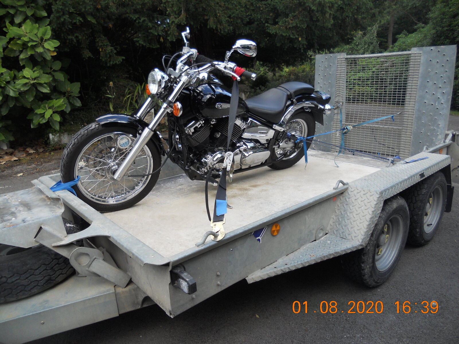 I had everything under control today and then out of the blue i received a phone call from a ex-neighbour.....could you collect a motorcycle from Newhaven today please,yeah ok why not but i mislaid or maybe lost the the other trailers hitchlock key and had to resort to the new plant trailer.I got the first ride out up & down the driveway before him,oh just so weird with forward controls.