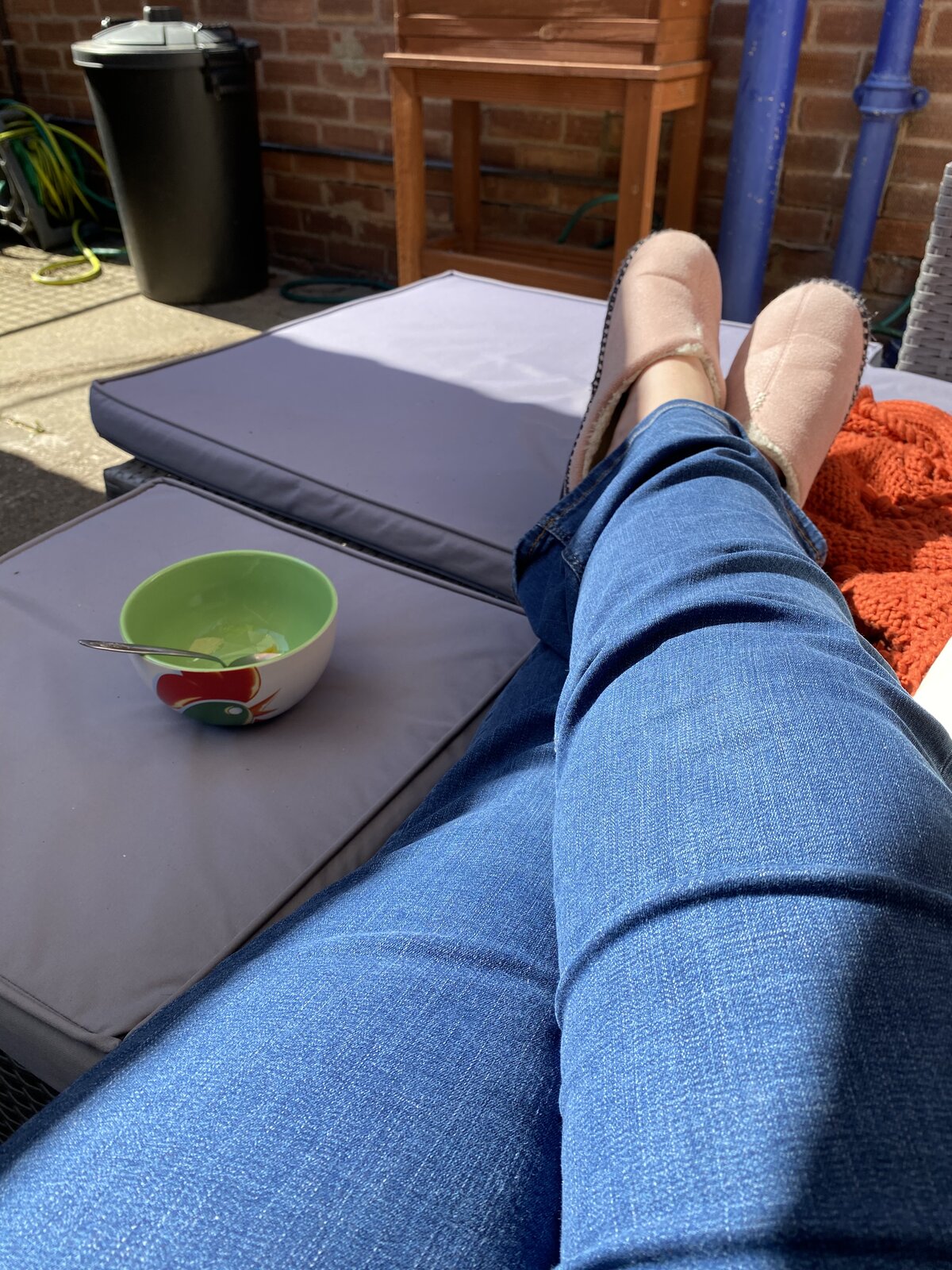 First thing we went to a garden centre to buy SWMBO some things she wanted for her birthday next month. And when I got home I “teak oiled” the garden chairs. And now I’m sunbathing with a nice cup of tea