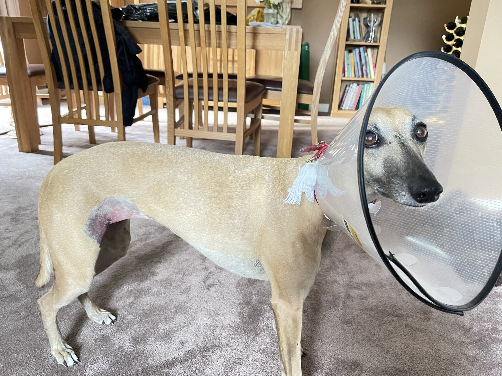 Zoey is home from the vets. She’s not very happy. Apparently she was very close to a main artery, so it could have been much worse. View attachment 273326