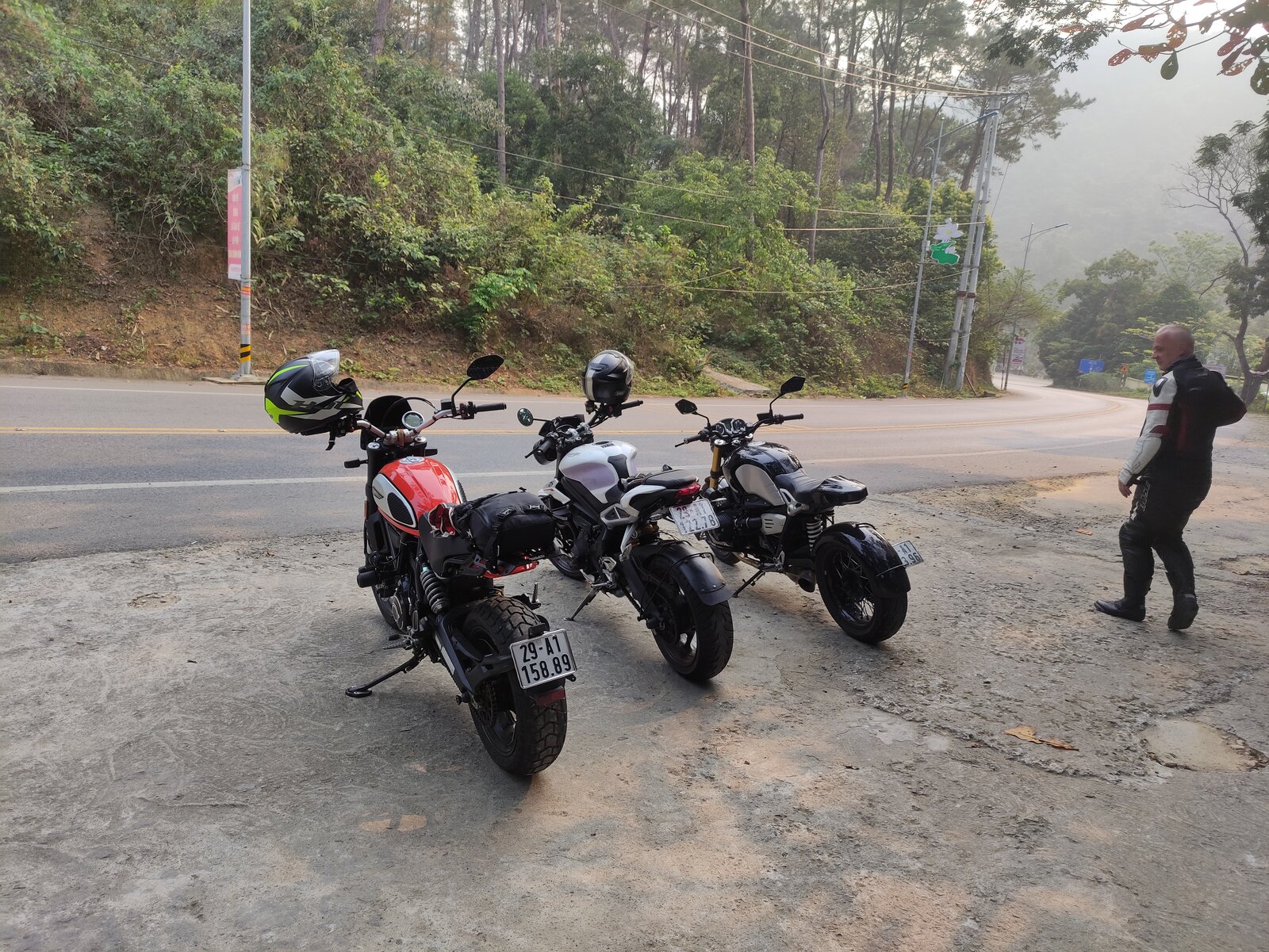 Day out on the Scrambler about 220 km playing up and down a twisty mountain road (several times...). The three musket ears, or rather, their steeds. A good day was had by all