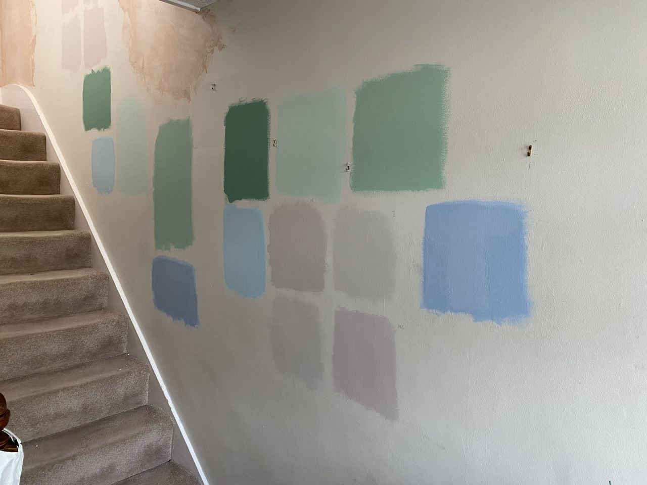 Decorators nightmare. Those test patches will all need sanding back now so you don’t see them through the new paint. Paint testers on to a white sheet of paper.