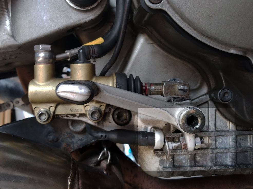 Further to the issue of the rear brake spring... I found that the rear pedal needed adjustment to the lowest setting to feel comfortable. Problem was the brake light pusher was then angled so that it didn't press the brake light switch. Solution, replace the pusher with a stainless M6 coach bolt. see the light section of the picture. This has a much larger smooth head and a 7 mm square section, useful when tightening the locking nuts.