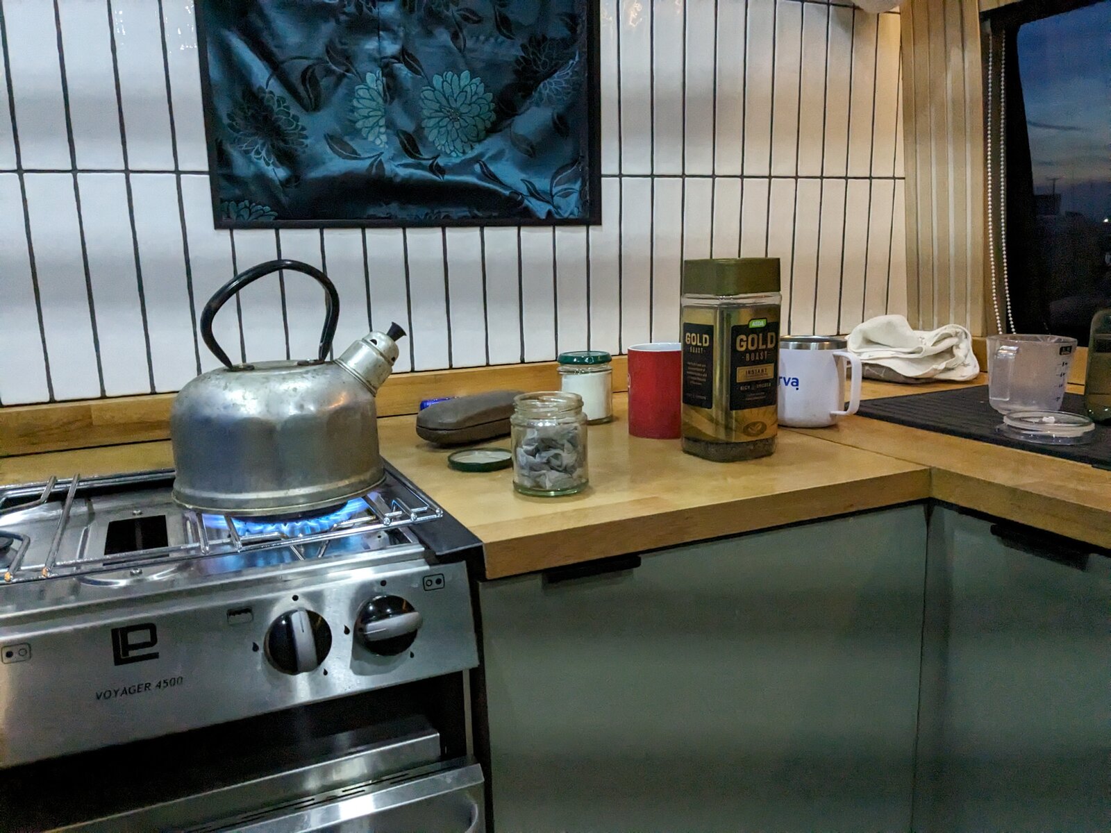 Yeah, whatever. It's like bloody November now here at Brands. No tables in the kentagon for food, so back in the van and emergency pizza's