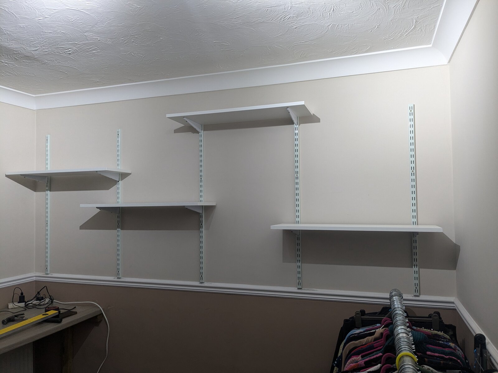 Some good brownie points in the bank today. Fitted a bit of worktop in our spare bedroom for the wife's sewing machine etc. Also put up some twin slot adjustable shelving for all her sewing stuff. She's well happy. So am I as nothing has fallen down yet !.