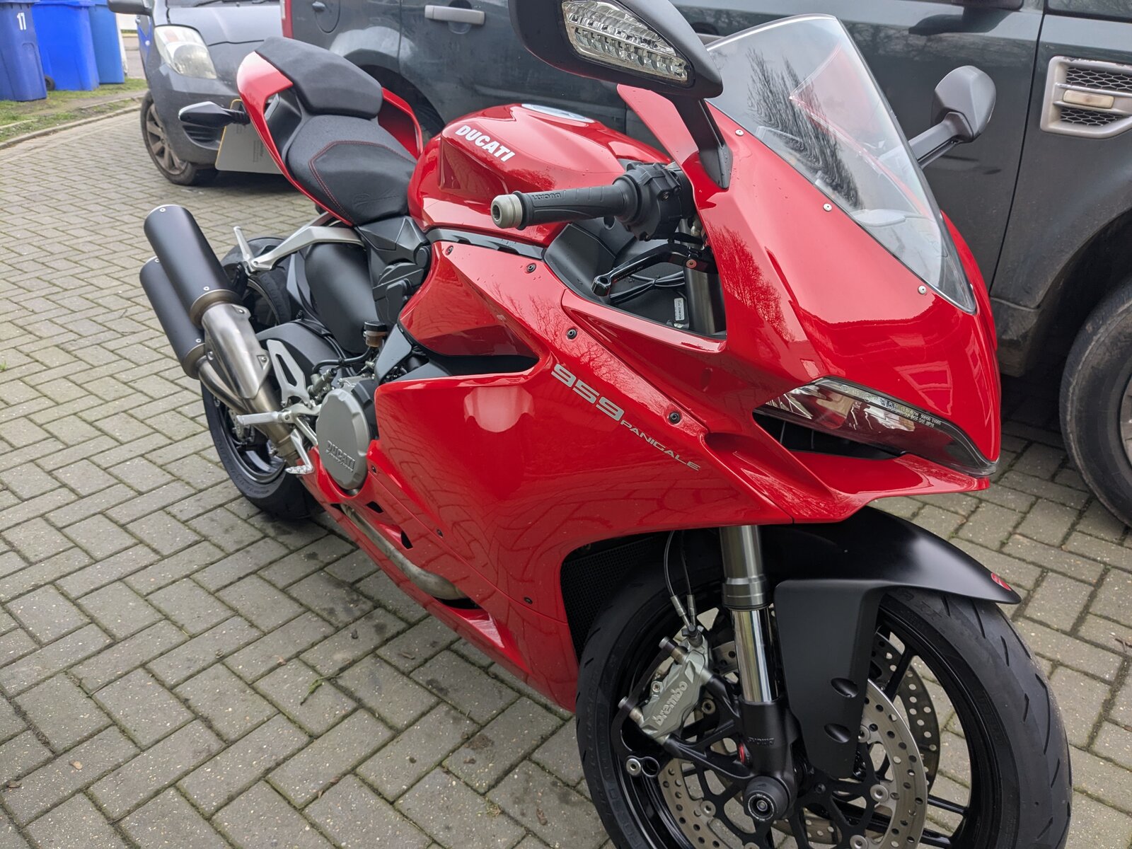 I had a call from a mate last night asking if I could pop around in the morning and help him lift some furniture upstairs that was being delivered between 9 and 10 in the morning. Of course no problem. What turned up was a 959 panigale the cheeky bugger ! . I was totally surprised, he's over the moon and I'm so pleased for him. It looks mint, 67 plate just under 8k miles . He got it for a great price and the guy gave him a more than good price for his 821 hyperstrada so happy days.