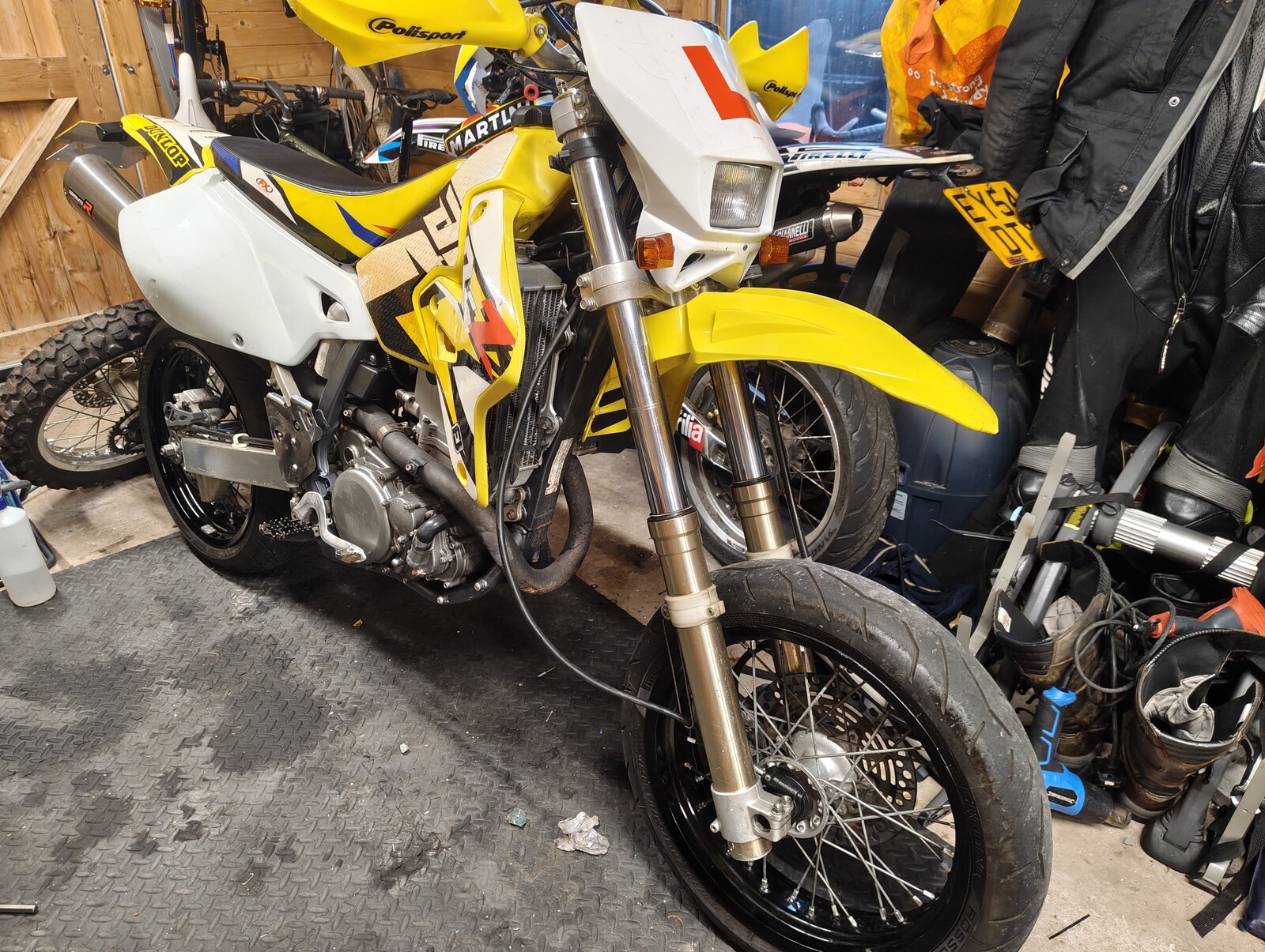 Rode this DRZ400E to DVSA test centre for Sons A2 mod1 test, he passed with a clean sheet. Mucho panic when we arrived his L plate had fallen off, off to Halfords I darted to buy a set of learner plates and mount it. 10 days until mod 2 and then hopefully no L plates for another 2 years.