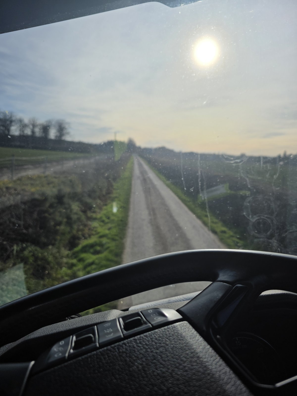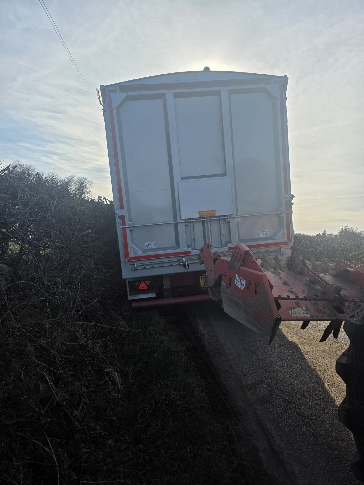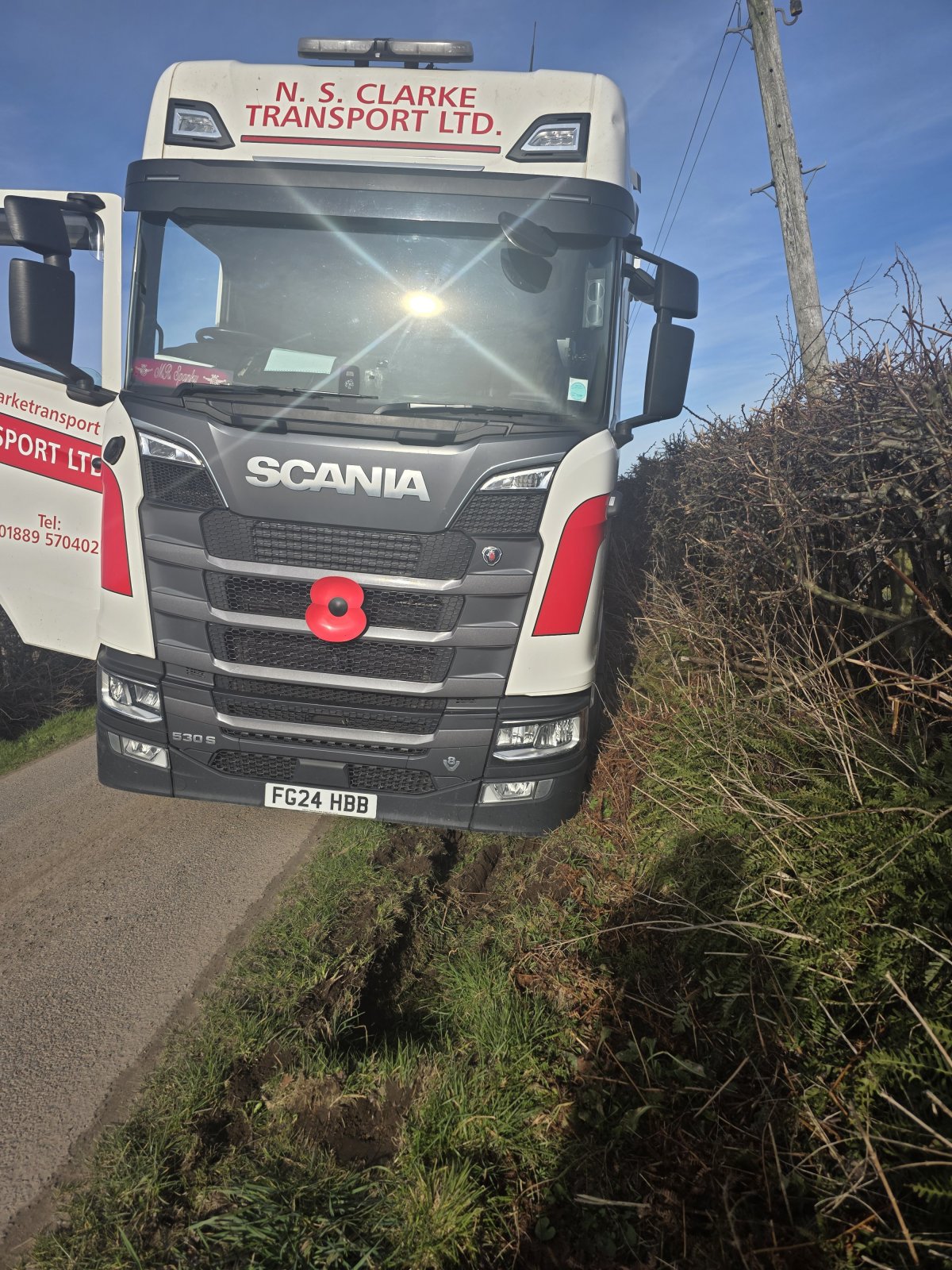 Could be worse, after 4 months off sick with my broken elbow, I eventually started back at work on Wednesday 18th March, on Thursday 19th, I had a slight mishap, whilst checking the offside wheels on the trailer as I turned in to a farm drive, I put the front left wheel on the grass verge..... Oops