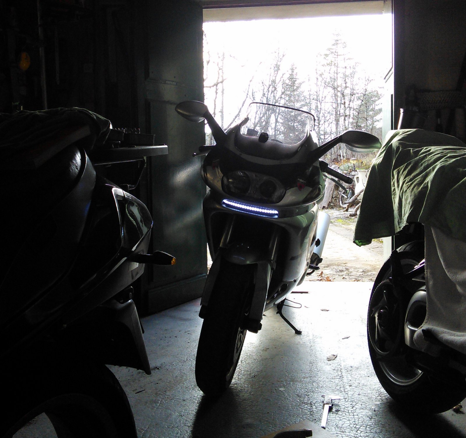 Latest idea. Fit a Audi style DRL LED strip under the headlight. Works much better then the photo shows. With that on and all the connections to battery removed, cleaned and refitted, I am getting 13.9 to 14.1 volts showing while riding.