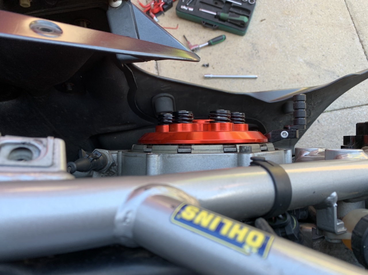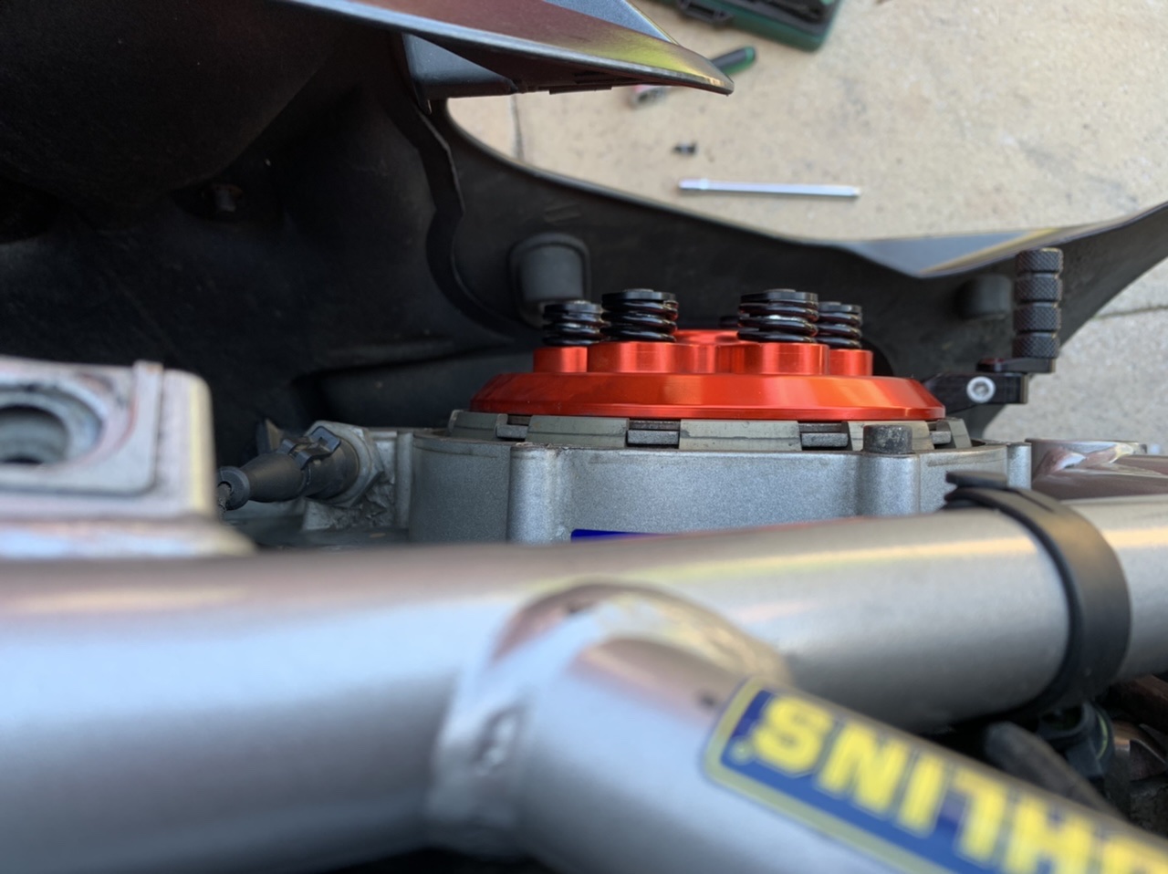 Just been out again, not sure if that is from the slave cylinder, there is no room for it to come through(hole is too small) I took a couple of pictures of the effect the lever span has on the travel of the clutch. Top is with the lever all the way out, bottom is close to the bars.