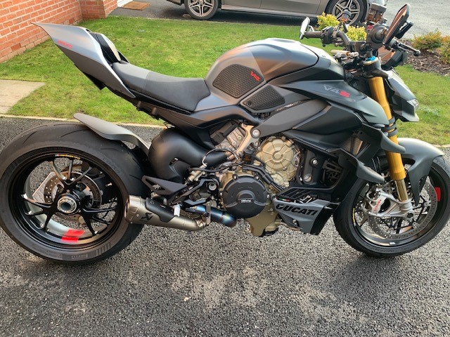 Not new to Ducati, been away for a few years, just an update coming back to the forum. Since selling the Panigale a few years back, moved to S1000R, R1, KTM12900 Superduke R, Aprilia Tuono Factory, I now find myself back to the bike I meant to buy a good few years ago. Just picked up a 2022 Streetfighter V4S, Matt Black. Bought it from Ducati Glasgow who supplied it new, original owner had thrown everything at it new, full Akrapovic system, rizoma rear sets and some Ducati Performance carbon bits. Love this bike, suits me perfectly and I’ve managed just under 1000 miles since picking the bike up 3 weeks ago! Not had time to get any decent pictures yet but here you go. Plan to fit carbon radiator side panels. The last owner installed the carbon winglets. They are going to be replaced with the single piece FullSix carbon GP wings. Also considering replacing the Akra’s with the GP under seat configuration. I love that look! In the meantime, I’ve dropped a note to FullSix to see if their carbon belly pan will fit around the Akrapovic system fitted just now. I’m split on the belly pan but it does look bloody good in shiny carbon! I did consider a Hypermotard 698 when I was in buying this. Had one out for an hour and loved it. Just letting enough time pass to let the Mrs get accustomed to this sitting in the garage then I will be sneaking the 698 RVE in beside it! Edit to add: Just ordered the throttle spacers from Ducati spacers. I bought the EBay speacials last week but after reading this forum, some good advice made me ditch the cheap ones and go for the Ducati spacers ones.