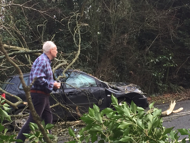 This mornings ride was interesting. 3 cars crushed beyond repair before me when a huge tree came down. No serious injuries, only a cut hand from one driver. Ended up directing traffic away until the Police took over. Happened on B2133 btwn Loxwood & Wisborough Green.