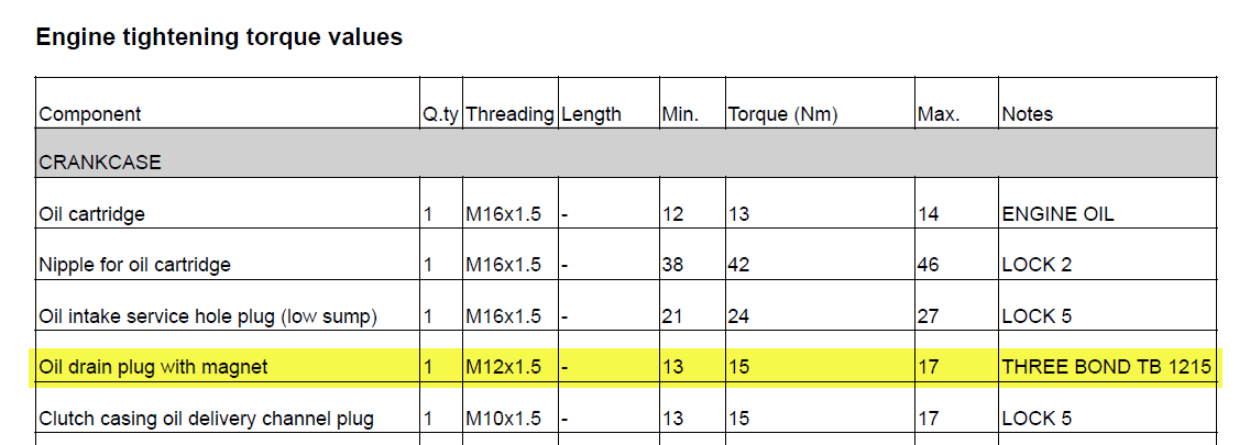 I did see it in an online version of the ducati manual at one point. It's amazing the number of sump plugs i have changed because they are so tight the allen hole is rounding off.