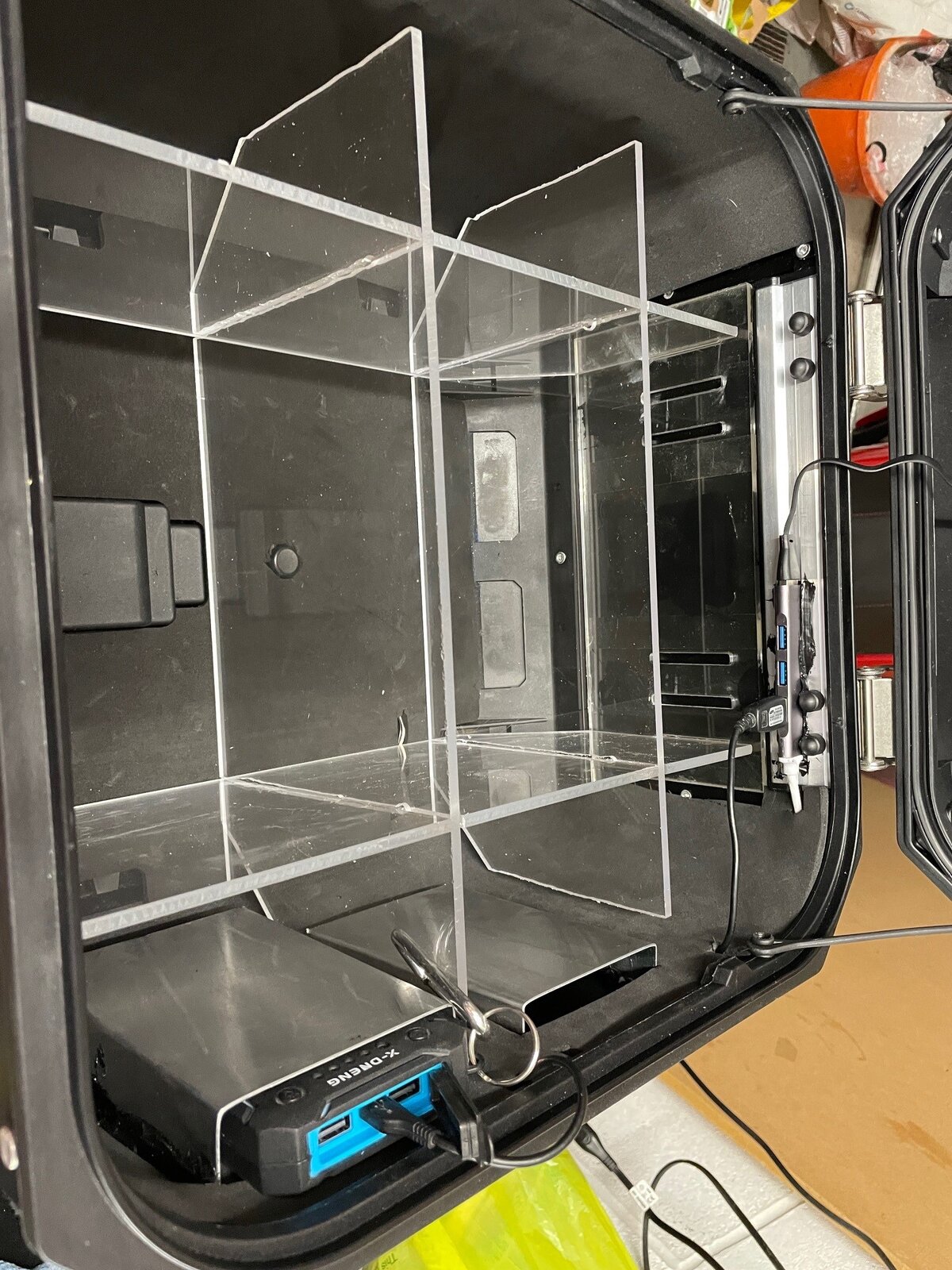 Hi All. Just thought I'd post about my top box dividers and electrification. I have a 42l Givi Trekker top box and wanted to have it compartmentalised and electrified so I can charge my equipment whilst riding. I purchased a divider kit (plus two extra dividers) from ebay thetopboxdividers33. The fit is excellent and easy to install. The extra dividers I created channels in each so the could slot over each other. For the electrics I utilised a GIV E101 Brake Light Kit and connected it to the USB power outlet under the seat of my DVT Multi. I purchased a small USB hub and connected that in to provide power (be aware that the power from the USB plug under the seat is only 1A). I had to drill a hole in the rack and the bottom of the top box but if you use a step drill bit its straight forward if you are patient.
