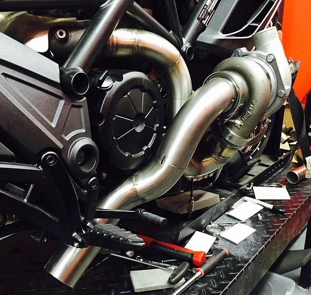 Not really the engine type to do that on or bike as it does not lend itself to many options for turbo placement or exhaust pipe routing. Hardly any real info given, and the dyno sheet gives no RPM, so not sure where those figures or graph represents. Still I am sure someone loves it.