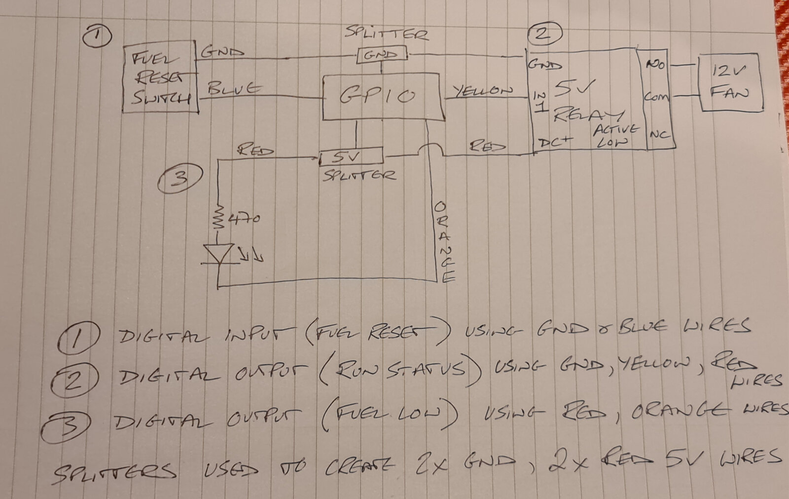 Been sorting out some of the wiring to make use of the GPIO functions of the Afterburner and how I 'think' the wiring should be, for the two GPIO outputs and the one GPIO input I want to connect. (3) GPIO OUTPUT powers an LED that indicates a fuel low status by measuring the total dosage count of the fuel pump and shuts the heater down if it reaches a predetermined level, so as you don't run the pump dry and damage it and have a flame out and need to prime the system again. (2) GPIO OUTPUT controls a relay based on the run status of the heater, that switches on a 12v fan that sits inside the flight case where the heater will be, to aid cooling whenever the heater is running. (1) is a GPIO INPUT reset switch, which will be outside next to the fuel tank, so whenever I refill the tank, I press it to reset the fuel usage to zero on the Afterburner and clear the low fuel LED warning. The second image is an addition to the first as I omitted to include a 12v supply to the fan. The relay module has a built in diode to protect the Afterburner from back EMF produced when the magnetic field collapses in the relay's coil when it is de-energised (heater run status is OFF which kills power to the fan)
