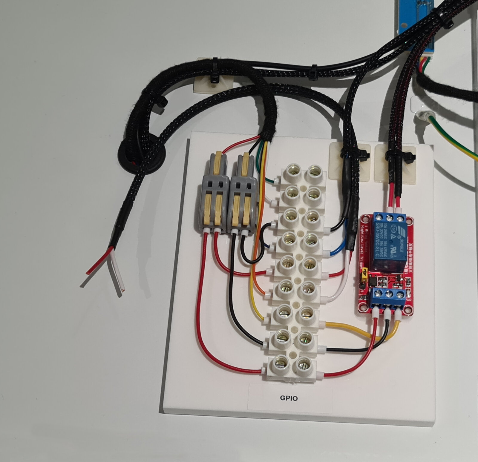 Now finally onto the wiring. First off was the GPIO wiring from the Afterburner. There are 7 GPIO wires in total. Two inputs, two outputs, one analogue ouput, one 5V supply and one ground. I will be using 5 of these in total to supply the fan relay, fuel reset switch and the fuel warning/low LED. I have split the GND and 5V supply wires using 1-2 connector blocks to service the relay and the LED light, these being the two GPIO outputs. The fuel reset switch is an input. All the wires are braided and heatshrunk, plus I fitted ferrules (using a dedicated crimping tool) on the ends for improved conductivity, as well as a cleaner more secure fitting into the connector blocks, as opposed to just bare wire. The gauge of these wires is very small, so stripping them required a delicate touch. The un-terminated wire is for the LED, yet to be fitted. This tool is an absolute godsend.