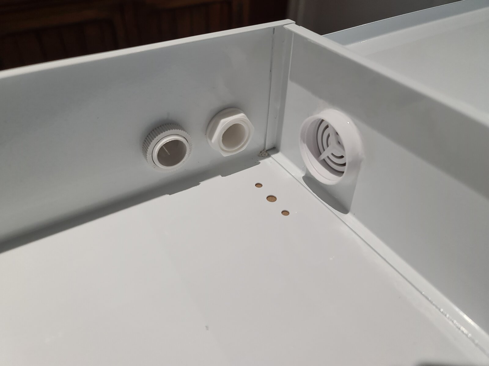 Here are the vents I bought for the enclosure, one will be at the bottom of the case and one at the top. These were siliconed into position and allowed to cure. They should assist in promoting some airflow in and out of the enclosure as well as aiding the PSU cooling fan. Here is one of the two vents fitted, as well as the gland nut for the 240V mains input (right) and the conduit fitting (left) for the wiring loom out to the heater.