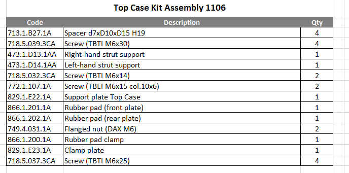 Thanks to @Andrew G and an assembly PDF I found on t'internet, I've managed to pull a list of the parts together to make a topbox mount. I've only ordered the bits today, so I can't guarantee everything is spot on, but it should be. JHP have kept my spreadsheet for future reference anyway. The parts in total came to £200 incl. VAT, so it's not necessarily a cheap option - I just didn't want to pay £446 for the box and the rack when the box is too big for what I want. I'm sure I can get a decent GIVI monokey topbox for under £150 - so going this route I should still save around £100 I guess. The only thing left to order is 4 GIVI screw covers for the top of the rack when there's no box on. You can get those on eBay separately for a couple of quid. I've attached the sheet in case it's of any use to anyone.