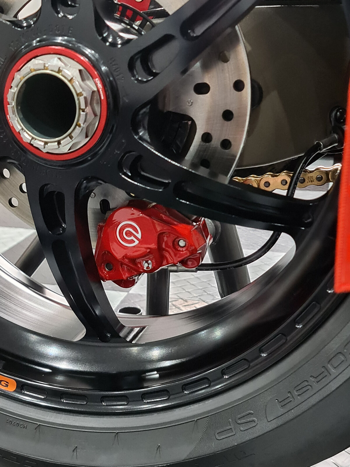Despite spending the past 48 hours in bed, it's amazing what a packet of Paracetomol will do, long enough at least for me to finish off the brakes, namely the rear caliper. Anyhow here are what a likely to be the last few pics of this thread, as to all intents and purposes, the bike is now complete. Feel like I have turned my chest inside out coughing, so I am off back to bed. Bloody Covid. All that is left is to torque up the rear wheel nut and replace the locking clip (not pictured). Whilst the rear caliper is not really visible from the left hand side of the bike, I am quite pleased with how it peeps out between the rear wheel spokes, though I accept this is entirely subjective. Finally complete. Nothing left now but to ride it.......roll on Spring!!