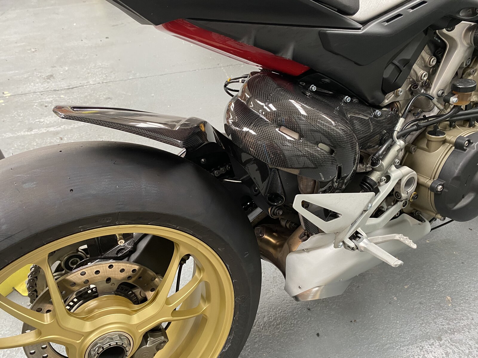 Few more jobs sorted. Swingarm protector arrived last week so fitted that. Managed to bleed out a big air lock in the cooling system. Harpic (thanks @Advikaz for the tip) and some scotchbrite sorted the exhaust a treat. Ordered some oil for a fresh change too. Still waiting a carbon front fender and exhaust cover and paint the fairings and it’s about ready. Finger crossed tracks are back open end of March.