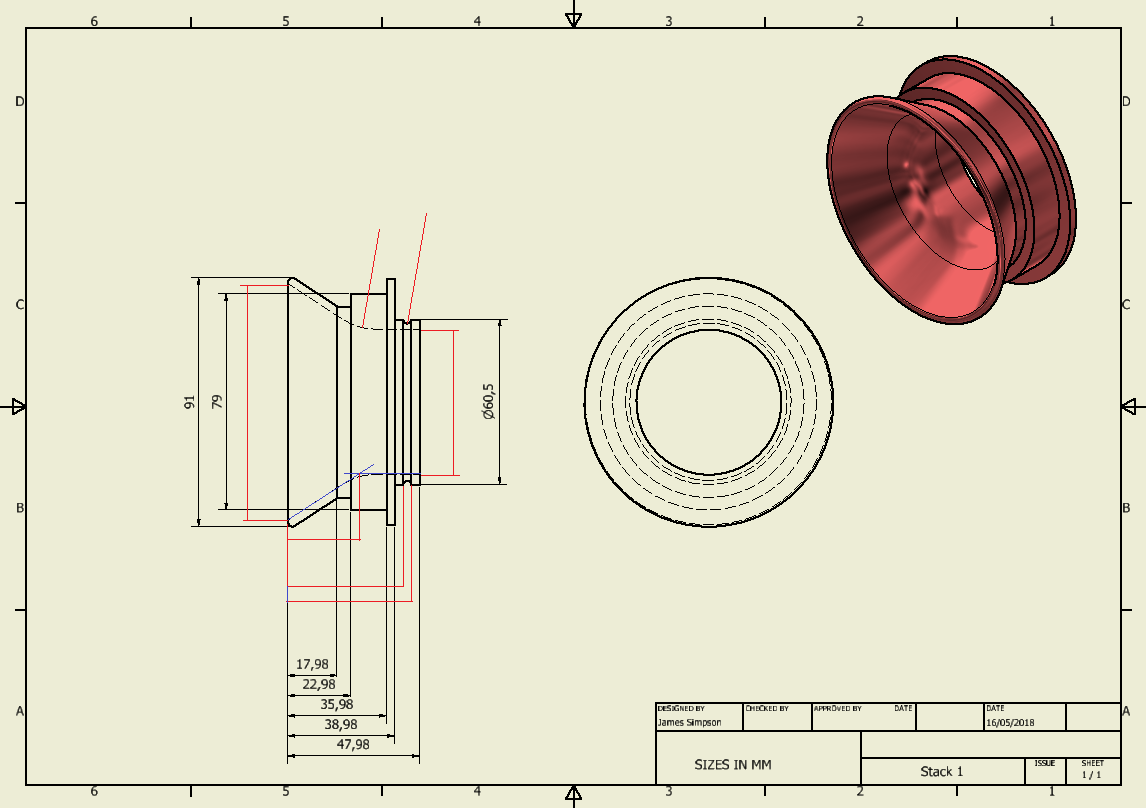 Unfortunately the transition between the taper and the inner straight section isn't a constant radius, I did try dimensioning the radii however the two sides cam out uneven (even though the part was revolved meaning it is symmetrical). Both of the start points of the curve are dimensioned so I guess you'll just have to "join the dots" when machining it.