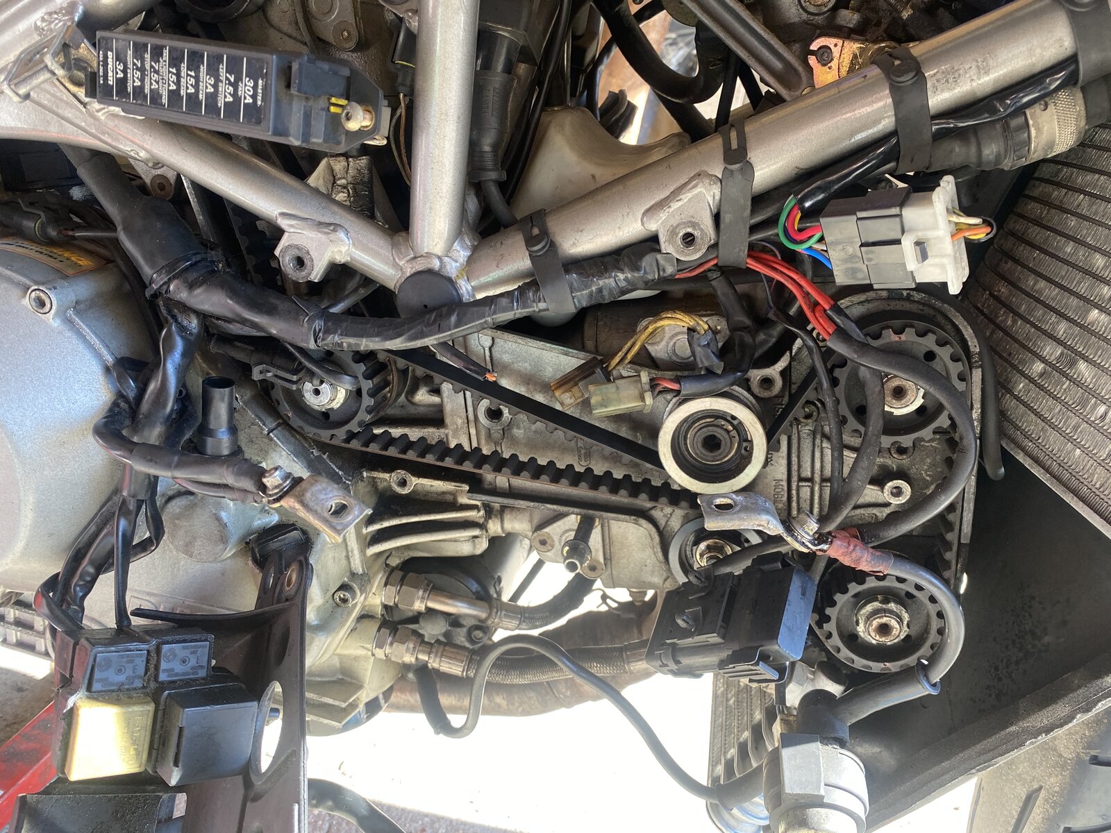 Thought I’d post an update on progress. Done a number of jobs on the car now: Replaced fuel filter (that o-ring is a sod eh reinserting the pump unit!) Replaced belts - old ones were in good condition but massively slack, and timing was a bit out as a consequence! New chain and sprockets - went to a 39 tooth on the back. Front calipers cleaned up (yes those attachment bolts need replacing ASAP!) Tired rear shock has come out. New brake master cap (a small but pleasing change from the rancid old one) And exhaust headers been Harpic’d and looking much better. Also taken the rear wheel off for refurb - that should be done tomorrow. Next big jobs are to strip the fairings and tank down to get those resprayed red and decal’d up and get some new dashboard bungs in as it wobbles about. Getting there!