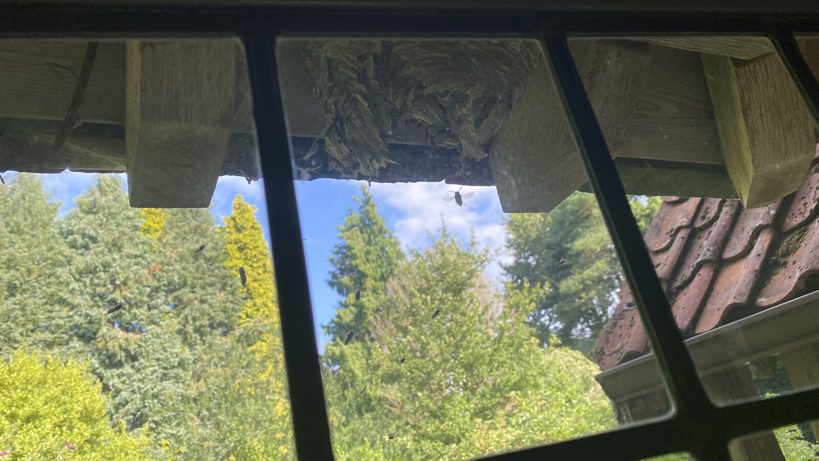 I bought an aerosol killer which has about a 3m range. Covered the nest in a gel that then turned to a shaving foam effect. Within an hour the nest was melted and chunks fell off. Was interesting watching the little fecks who weren’t in the nest at the time come back and flying around confused it was gone. Me 1 -wasps 0