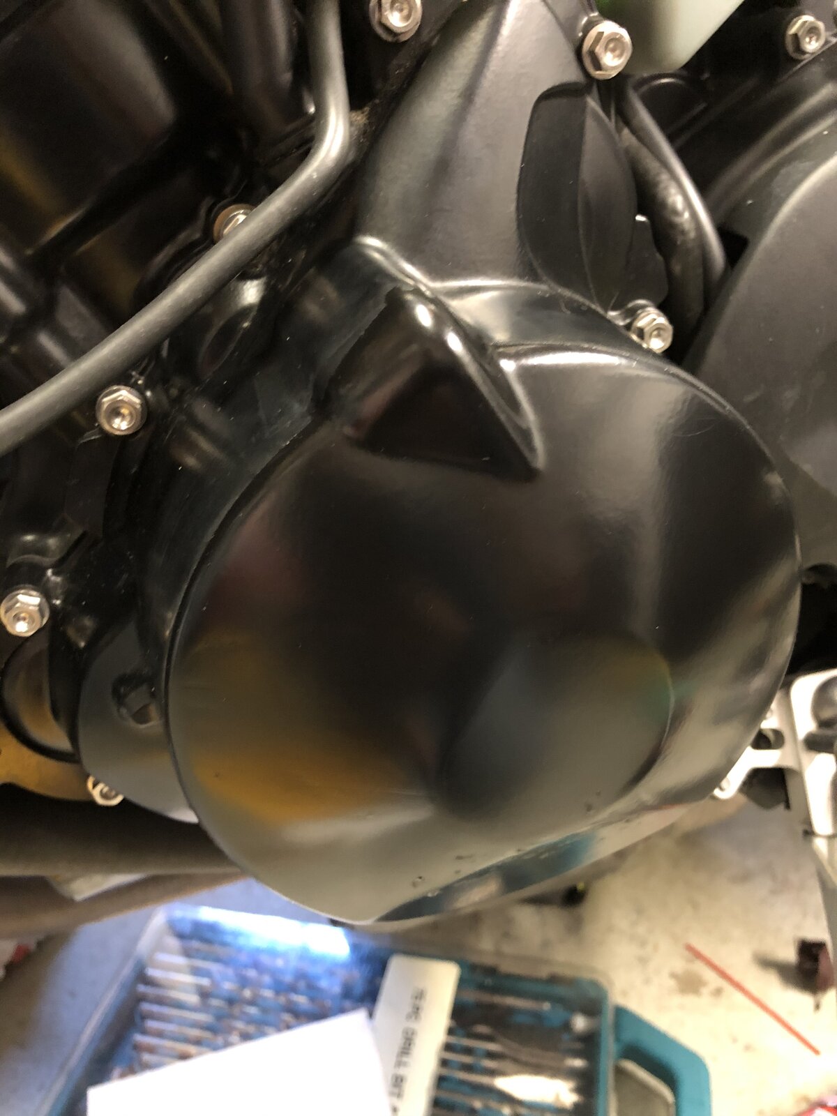 Oil and filter change time. No nasties in the oil and fresh Castrol Power Racing, Hiflo filter and crush washer in. Took it up the road about 100 yards. It selects 1-3 plus neutral ok. First ride!! While the fairings are still off I fitted the R&G rad guard that the previous owner gave me but never fitted. Why do people do that? A bit of a faff to fit I suppose so he couldn’t be arsed. My gain. Next step is to refit fairings (after a bit of a clean up), tax and insure and go give it the beans.