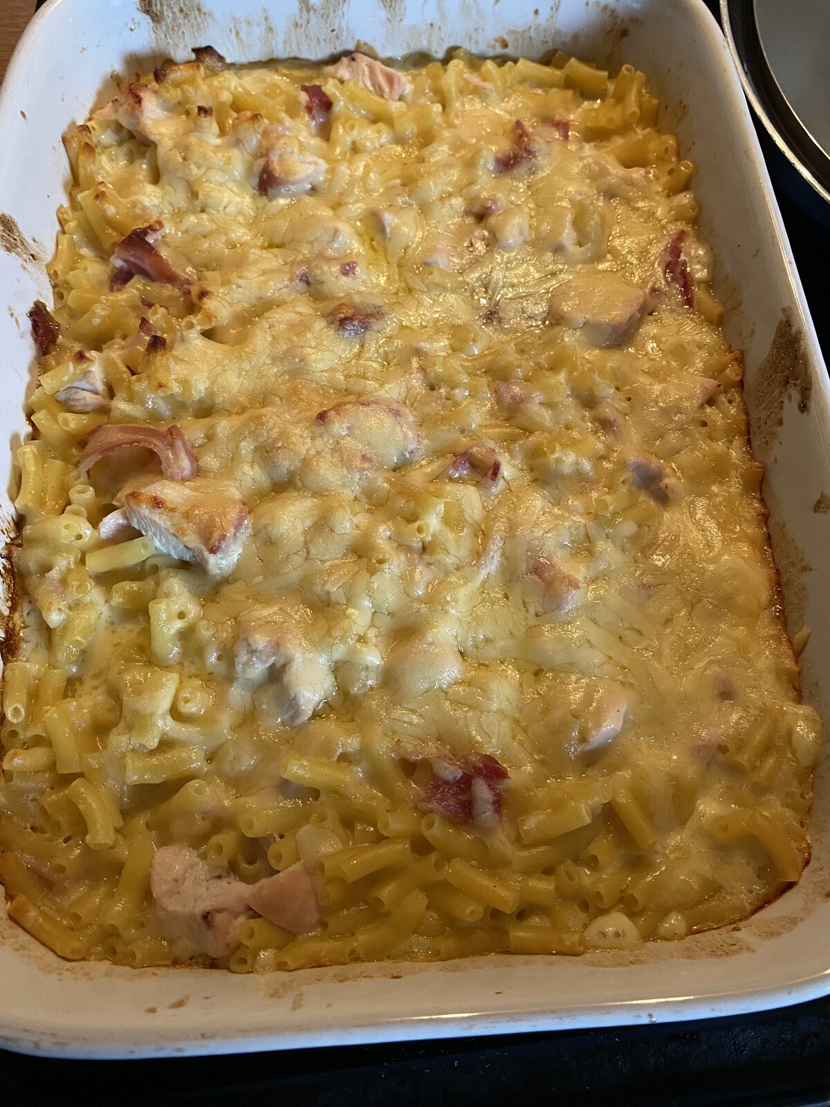 Made macaroni cheese with bacon and chicken for the first time today Cheese sauce from scratch Taste good