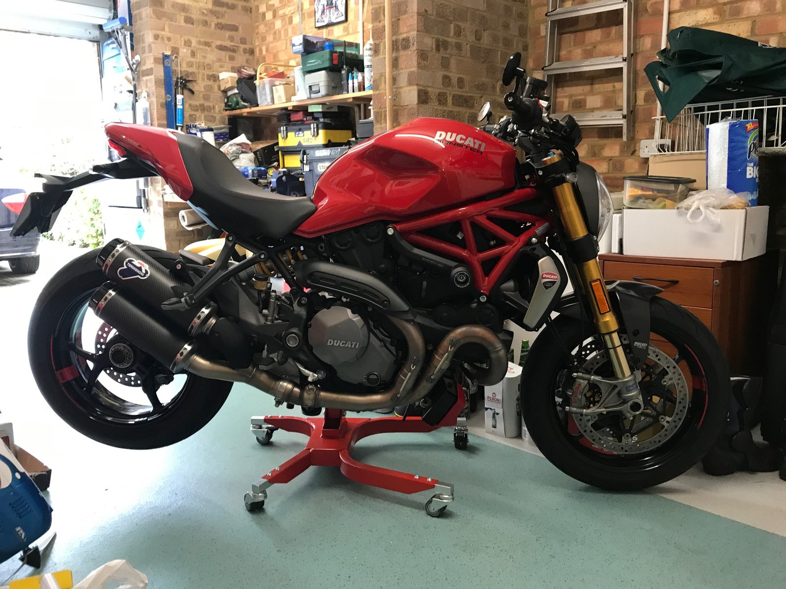 The stand is made by a company called Constands. You order it bike specific. The stands come with adapters for specific bikes. Costs around £220 which is about what you'd pay for a rear paddock stand for a single sided swing arm bike. Once up on stand you can remove complete front end of bike and swing arm etc and wheel the rest of the bike around the garage. Mine lives on it when I'm not riding. Makes cleaning wheels really easy. Took bike out today to test exhaust. Sounds really nice and bangs and pops on overrun. Looks good sounds good no brainer really. Should be better with remap next week.