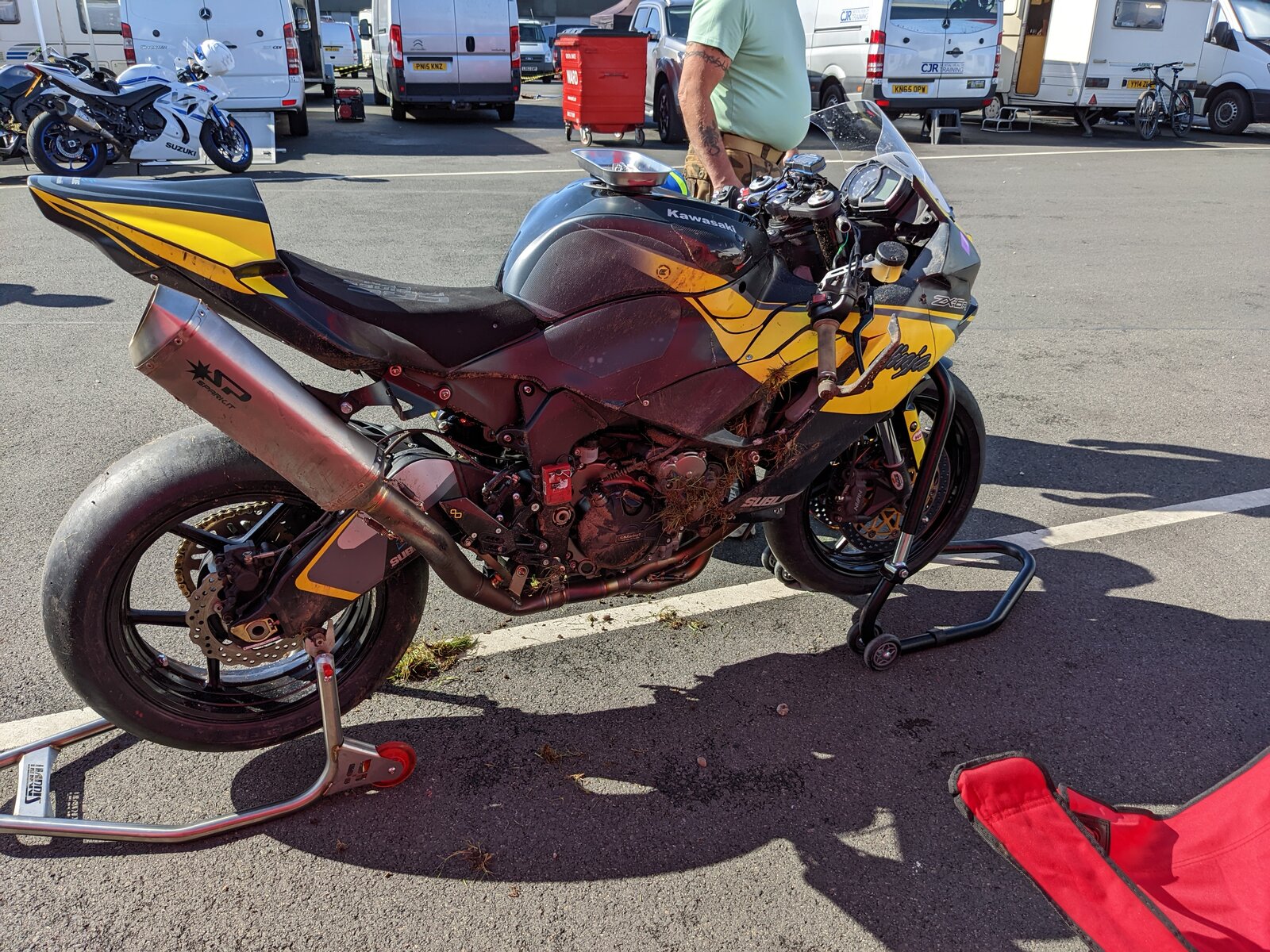 Race 1 is up in around 3 or so hours so the other race was on to fix the bike, get it scrutineered and back to get some heat in the tyres. Fortunately it was mostly cosmetic. Clip on snapped, peg ripped from threads (not snapped which would have been better), link pipe bent, exhaust hanger bent, fairings damaged etc. Luckily the schedule was running behind and we managed it!! Out for race 1 and I'm a bit tentative after my first ever crash, however starting P38 as I didn't set a time meant a fun race if nothing else. It's a bit sketchy with so much traffic, but I slowly made my way through to P9 in class, P15 overall. 23 places isn't bad. However I noticed I was down on power through the race and when we left the track noticed it was running at 115 degrees. Quickly got back to the van and noticed it was having a little wee. We missed that it had pushed a bracket through the rad. I'm now thinking the worst. Lots of effort for the next 3 hours or so and we managed to repair it, however the rad was massively bent after the crash so was hoping it would last.